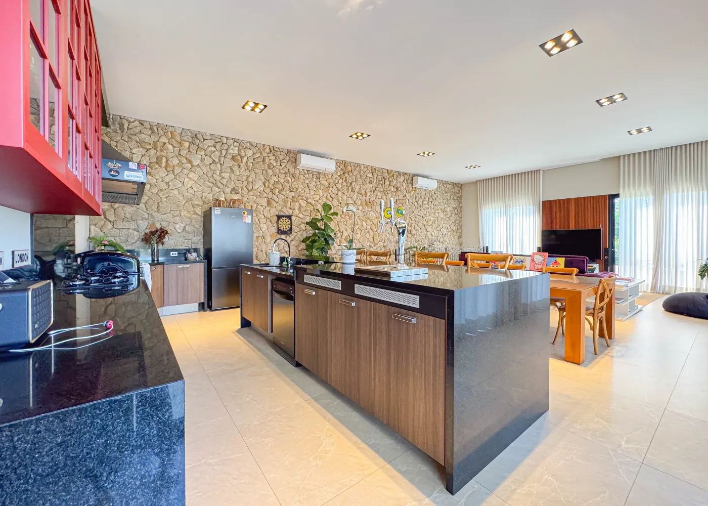 Átrio central com pé-direito duplo, criando um ambiente elegante e iluminado e lobby amplo, com vista deslumbrante para uma área verde exuberante. Cozinha planejada e funcional, perfeita para quem ama cozinhar, além de lavabos e área de serviço bem distribuídos !