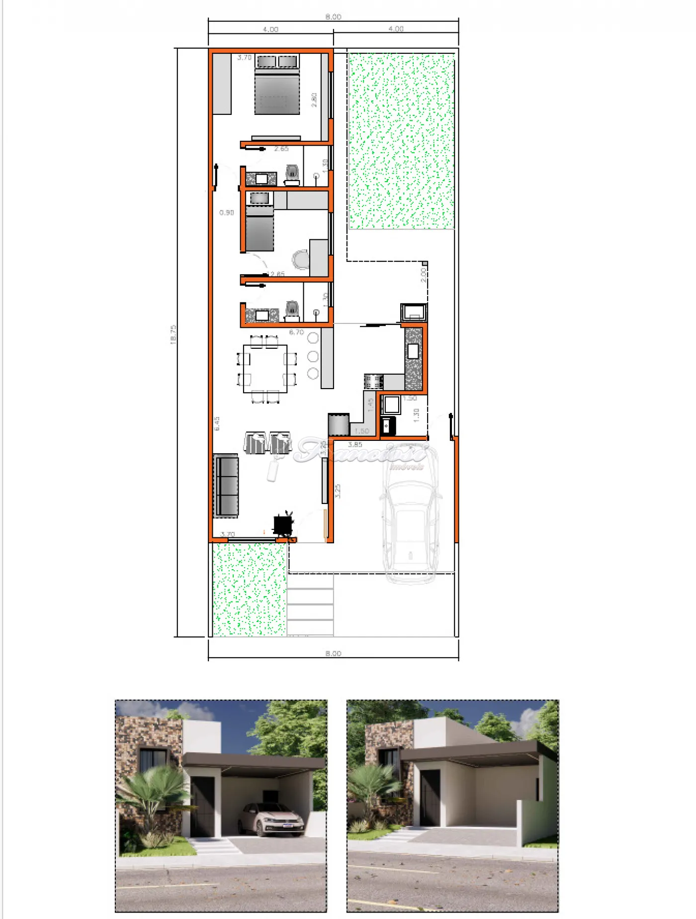 O imóvel conta com 02 dormitórios, sendo 01 suíte, sala de estar, cozinha, sala de jantar com pé-direito duplo, área de serviço e garagem para 01 veículo. Possui acabamento em laje e porcelanato.
