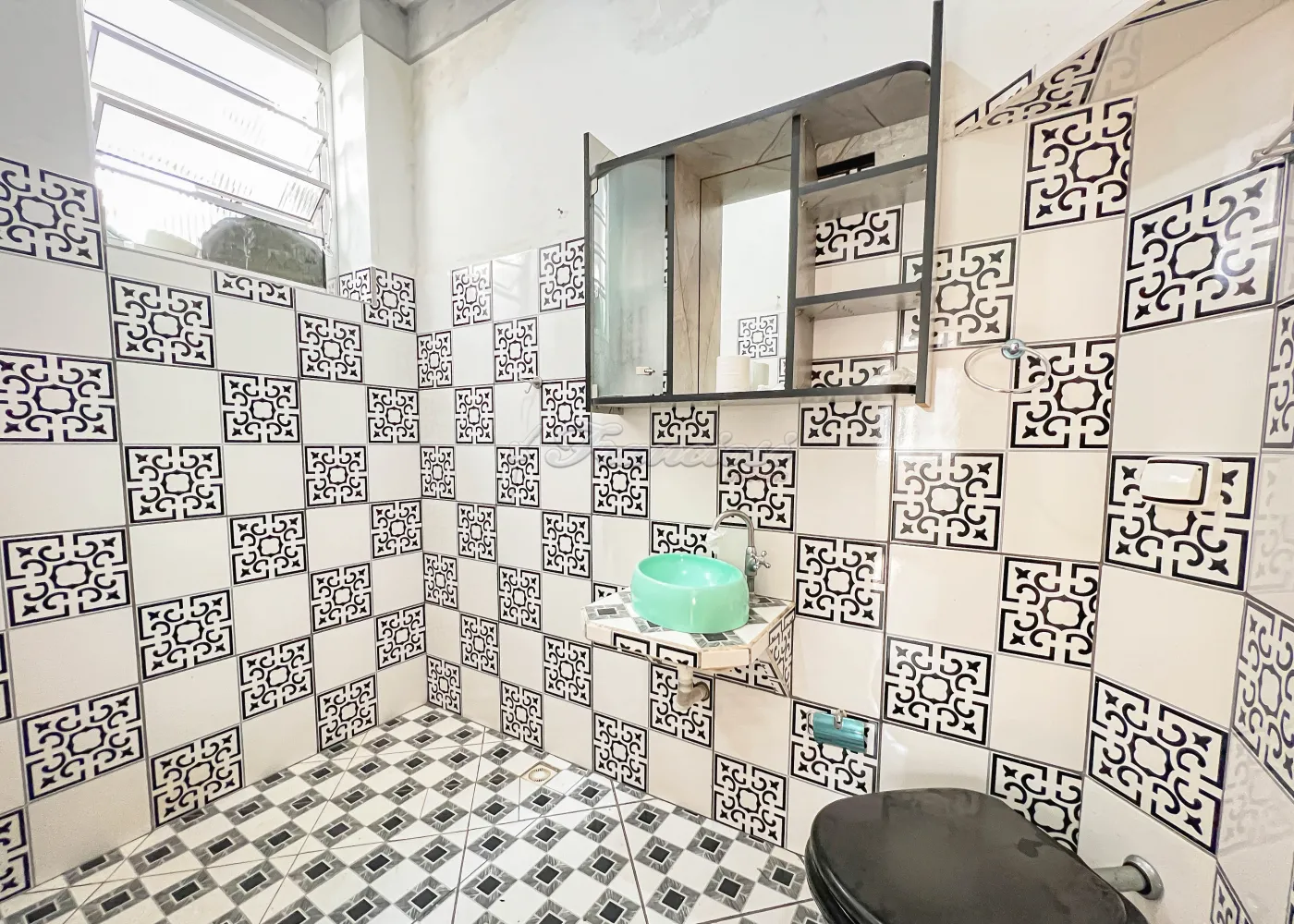 Acabamento: laje, piso porcelanato fosco e azulejos.