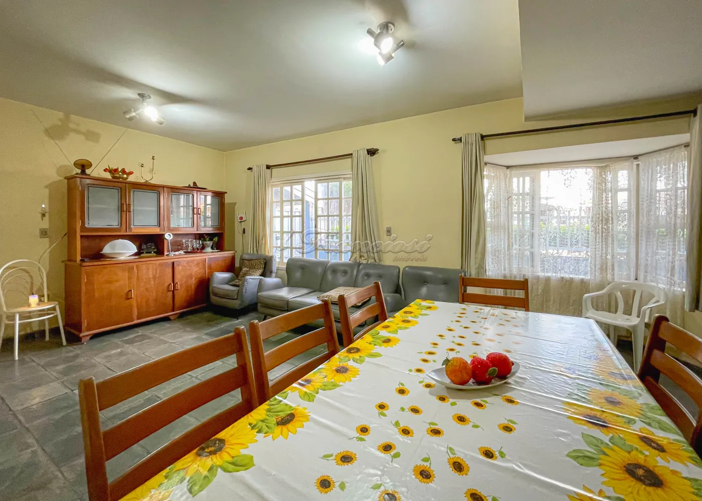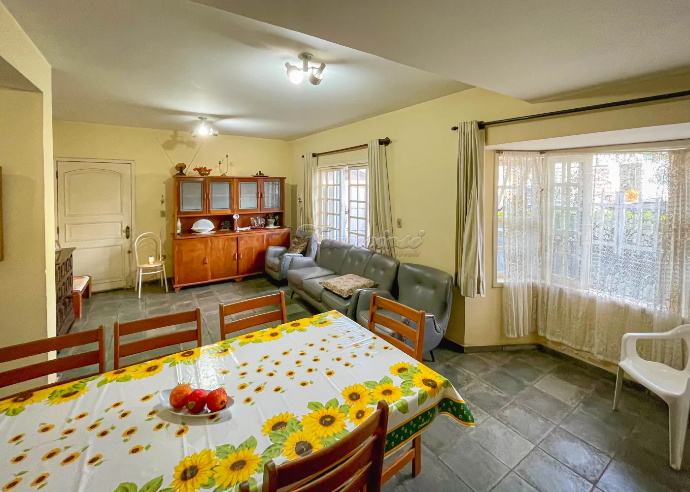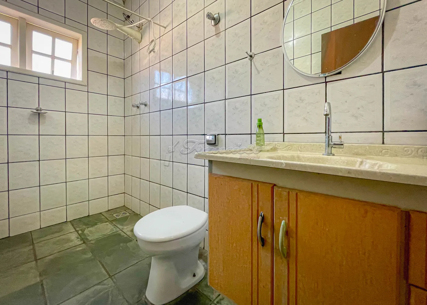 Parte inferior: sala, copa, 1 banheiro, 1 dormitório, cozinha, garagem com vaga para 5 carros, sendo 4 cobertas.