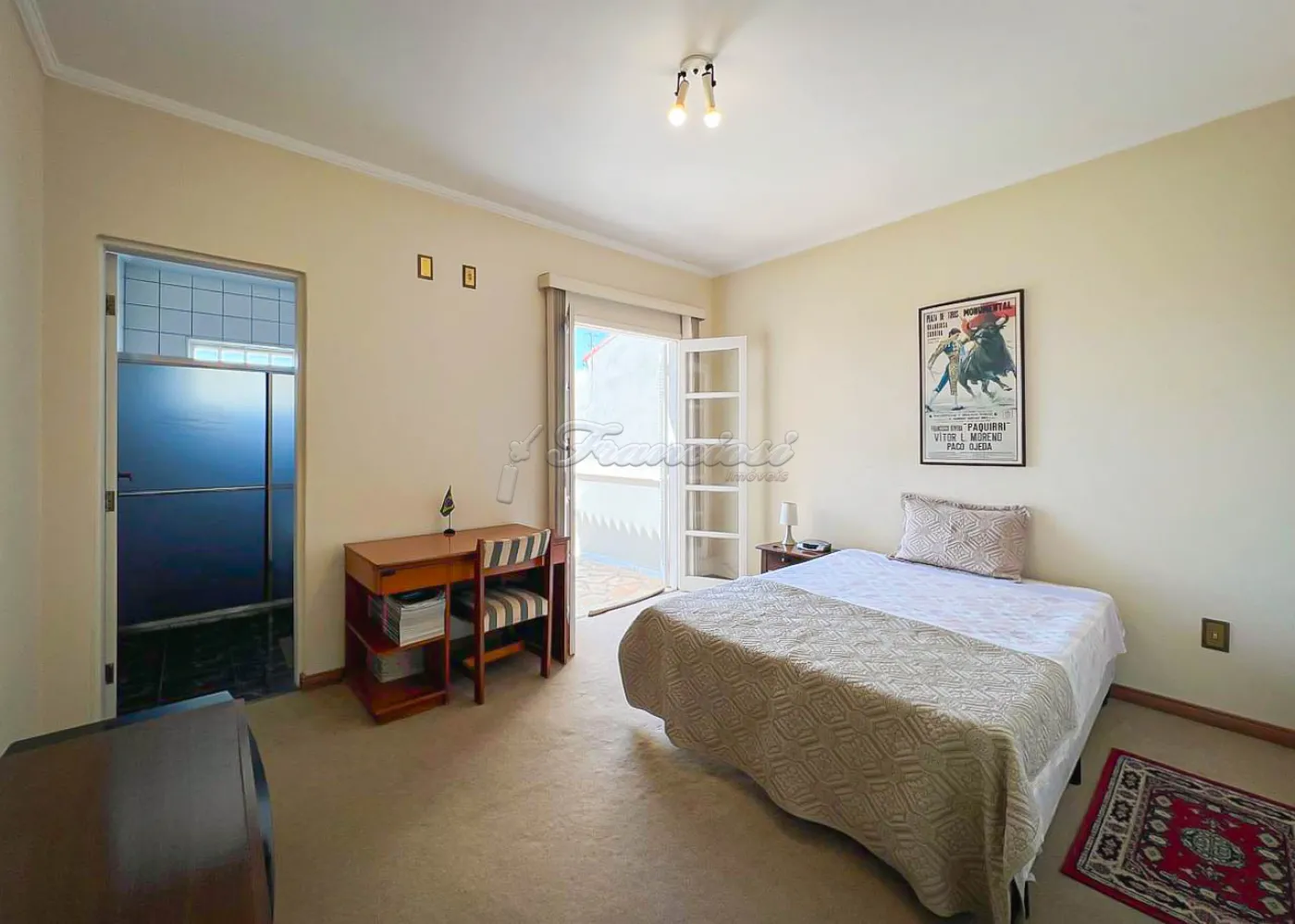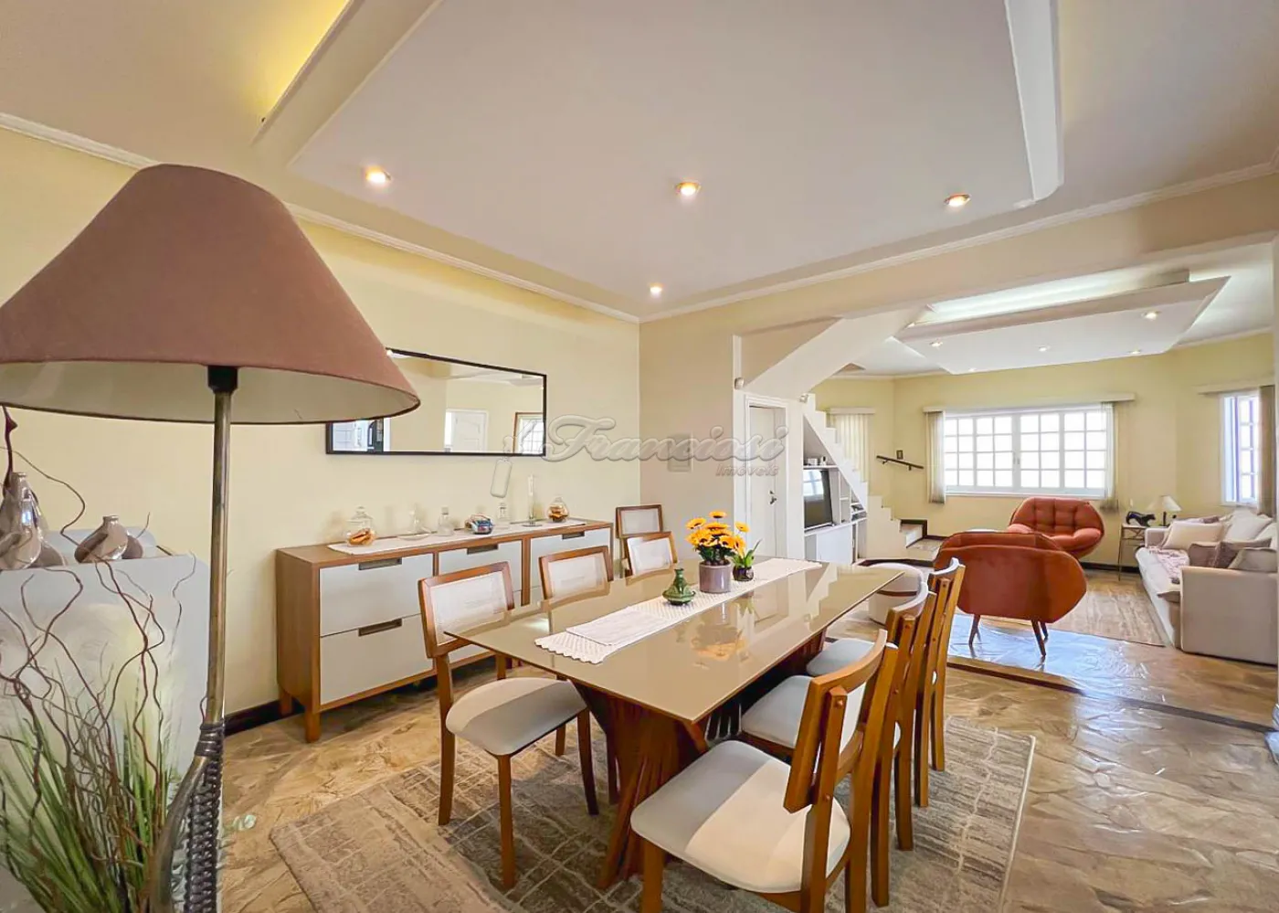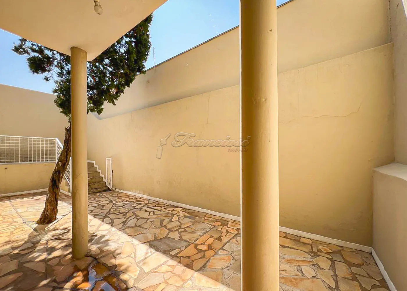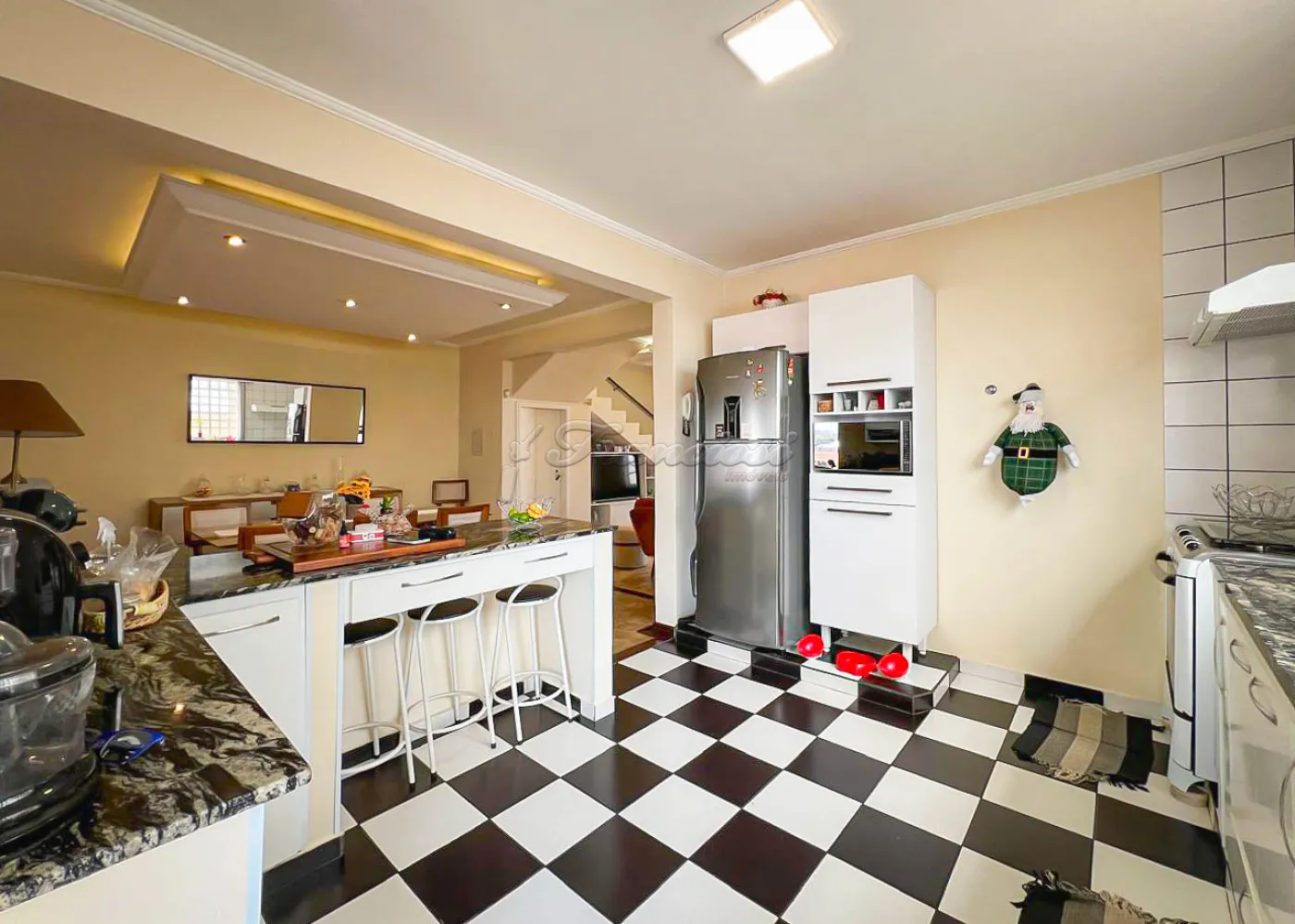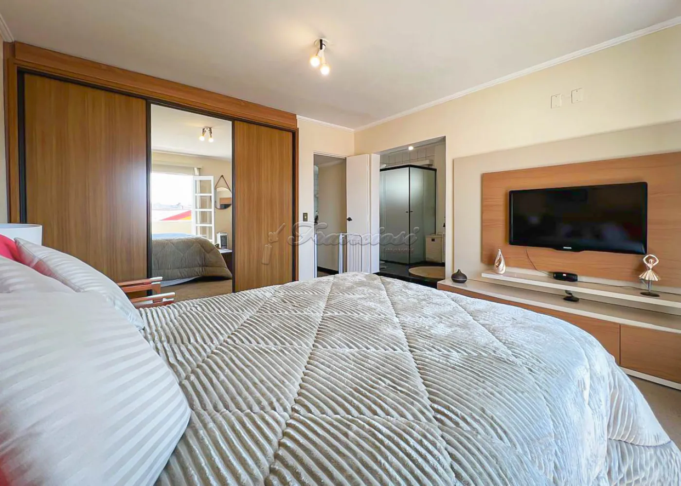 Sobrado localizado no Jardim Alvorada. No térreo, o imóvel dispõe de 01 dormitório, sendo suíte com varanda, sala de TV, sala de jantar, lavabo e lavanderia coberta. O quintal oferece churrasqueira, despensa e banheiro externo. A garagem é ampla, com 02 vagas cobertas e 02 descobertas. No andar superior, encontram-se 02 dormitórios suítes com varandas e um mezanino. O imóvel conta com portão eletrônico, acabamento em laje, piso frio, carpete e detalhes em pedra São Tomé.