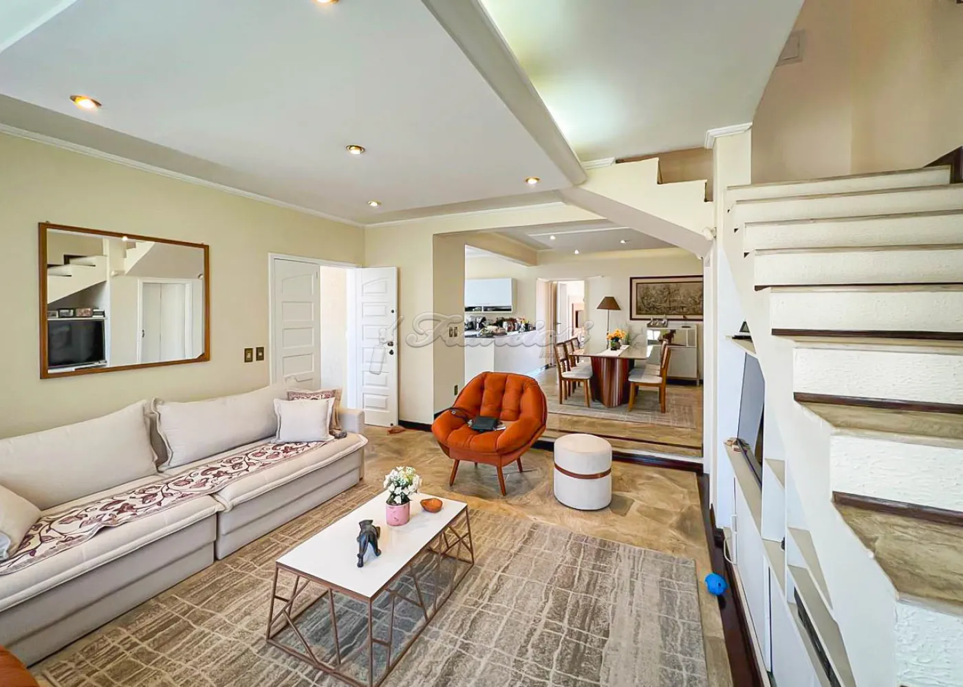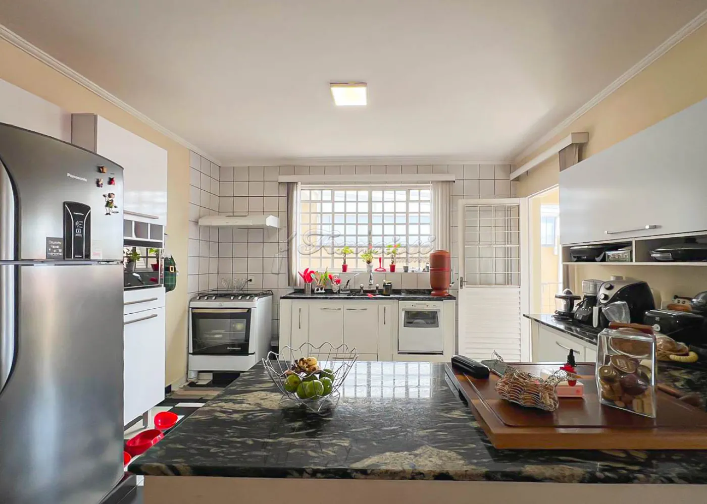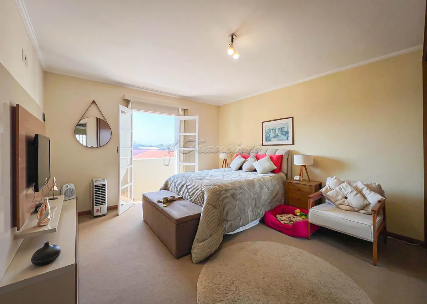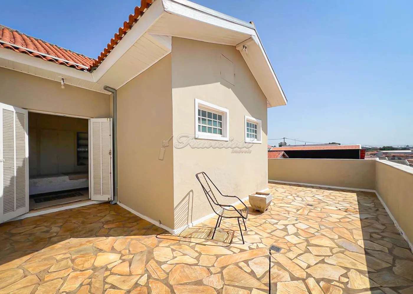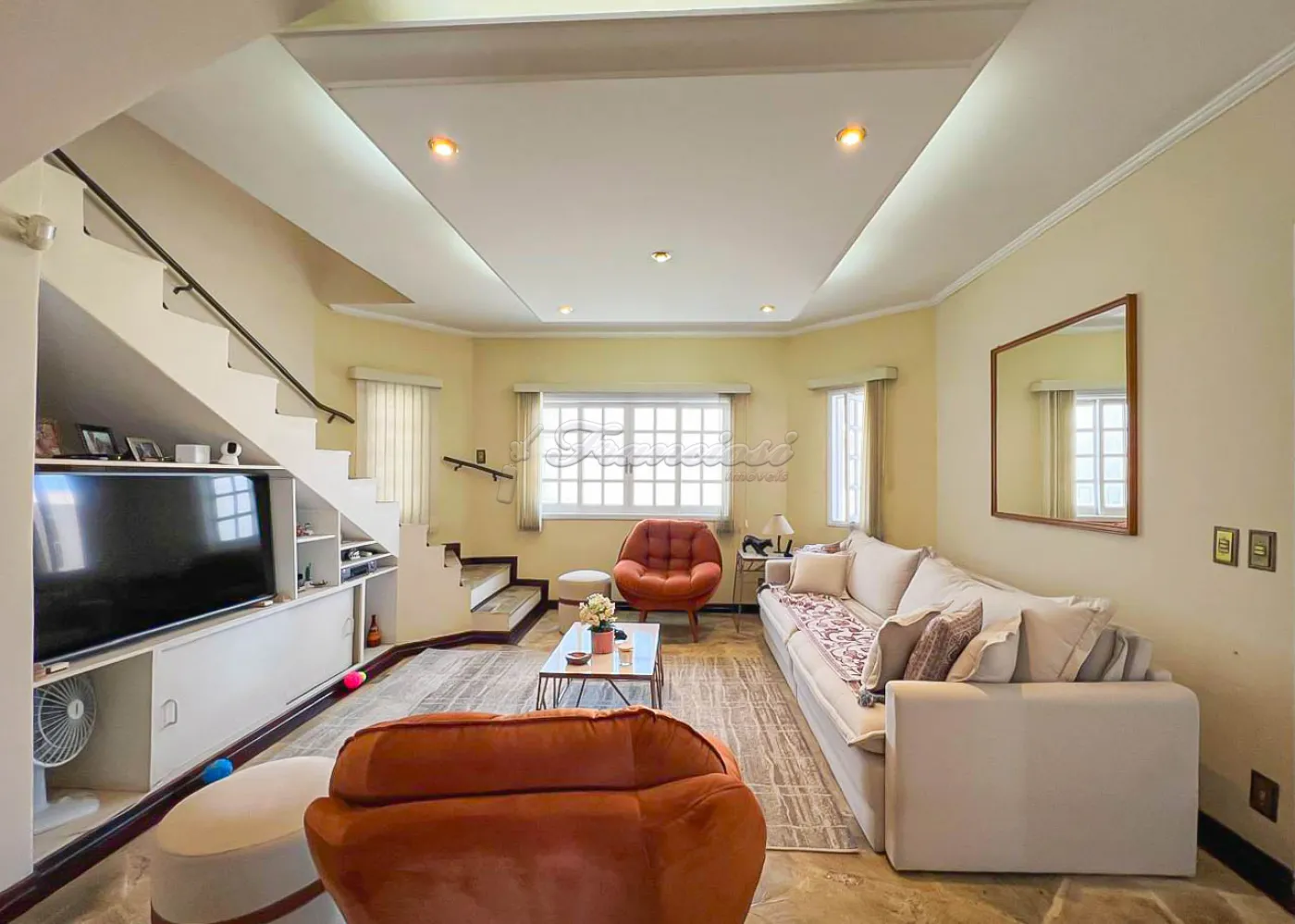 Sobrado localizado no Jardim Alvorada. No térreo, o imóvel dispõe de 01 dormitório, sendo suíte com varanda, sala de TV, sala de jantar, lavabo e lavanderia coberta. O quintal oferece churrasqueira, despensa e banheiro externo. A garagem é ampla, com 02 vagas cobertas e 02 descobertas. No andar superior, encontram-se 02 dormitórios suítes com varandas e um mezanino. O imóvel conta com portão eletrônico, acabamento em laje, piso frio, carpete e detalhes em pedra São Tomé.