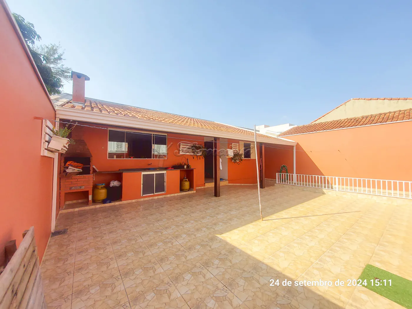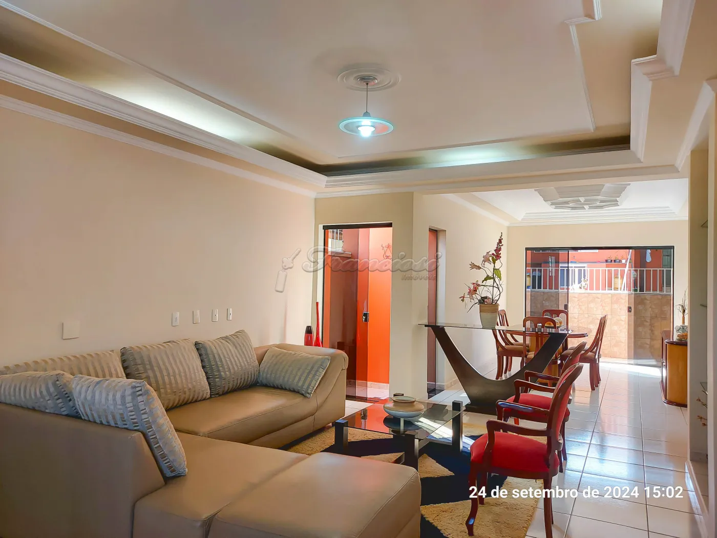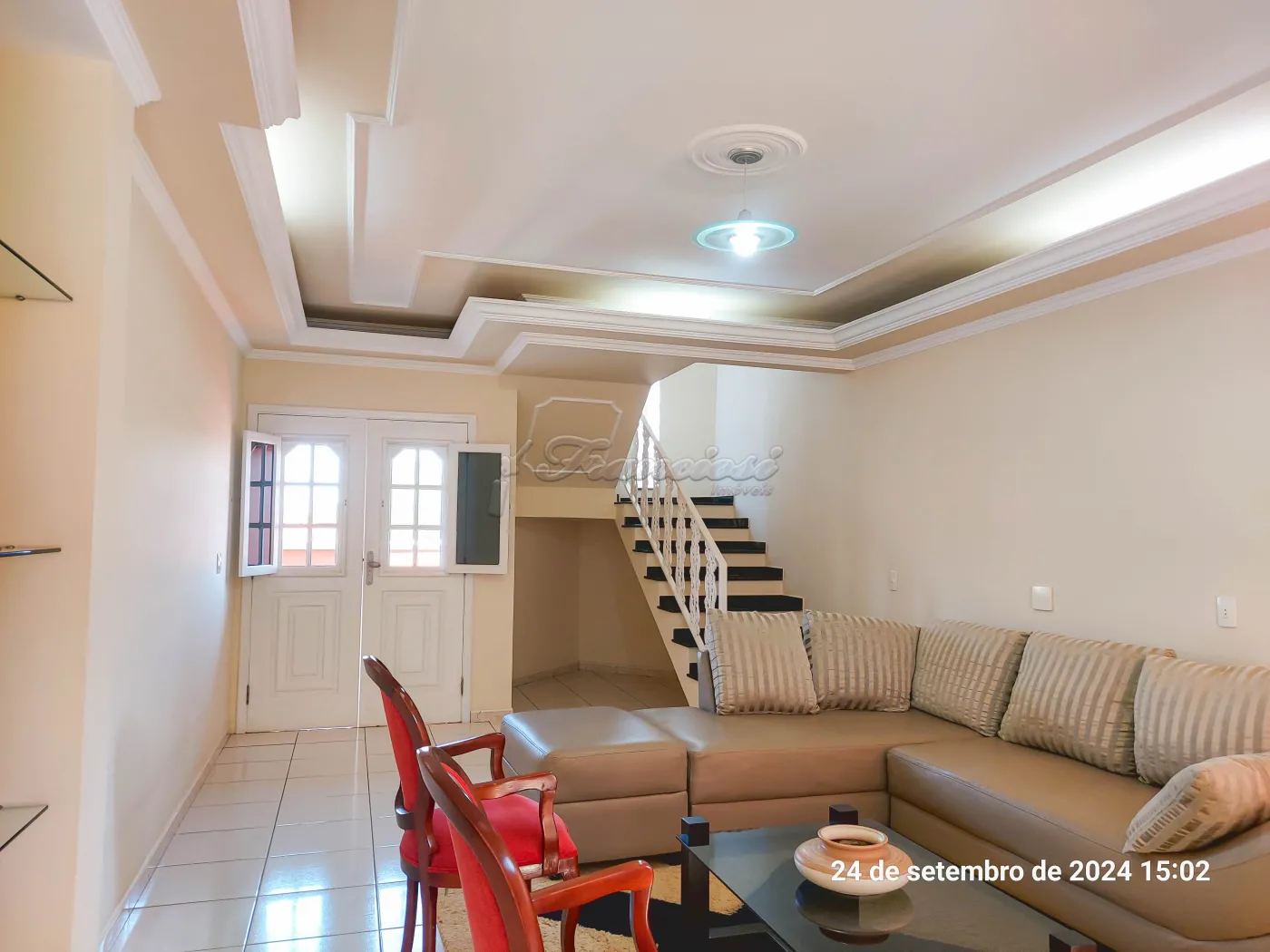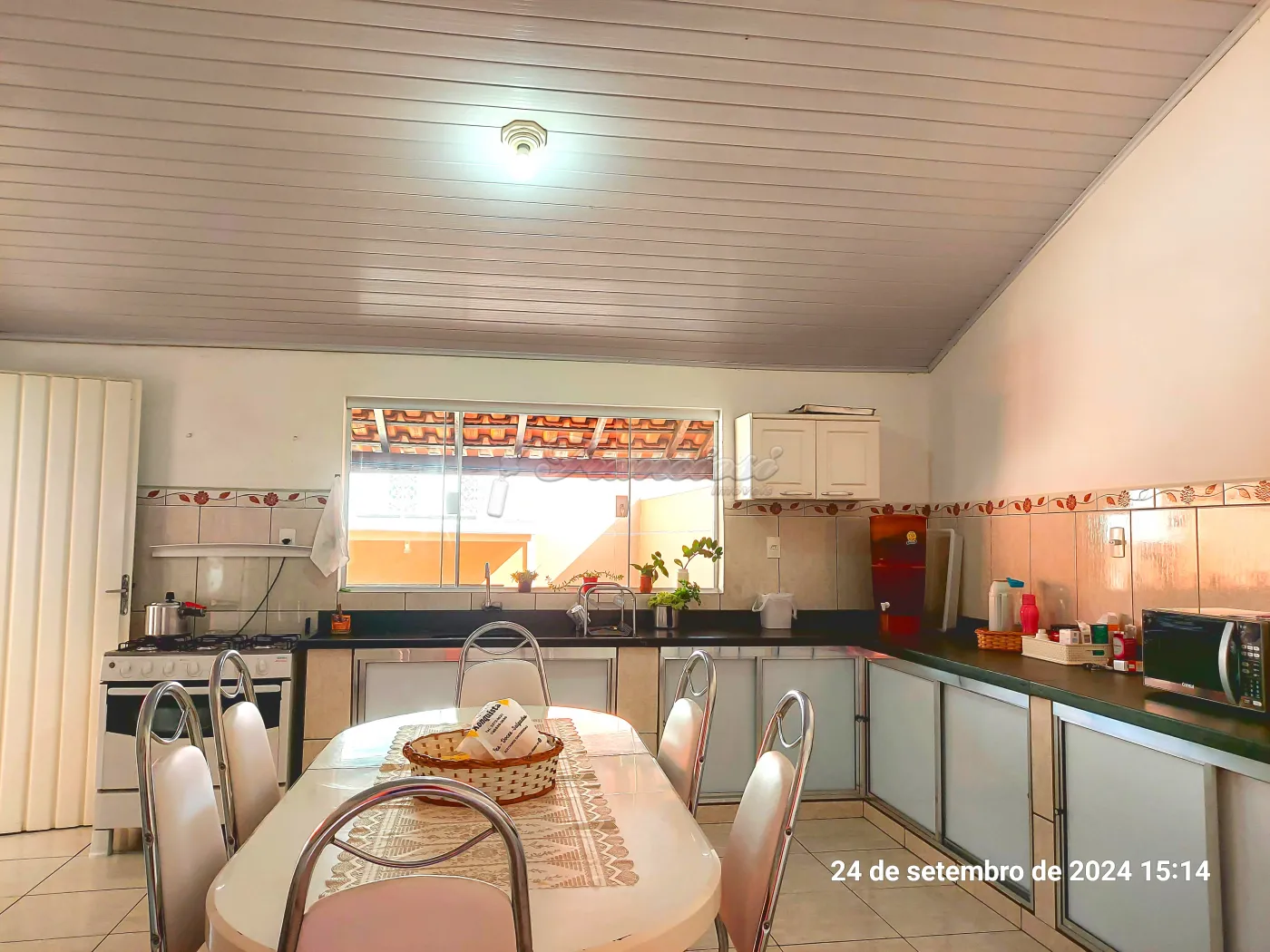 Parte inferior: Sala de estar, sala de jantar, cozinha planejada, lavabo, área de luz, quintal grande com churrasqueira. Edícula com 1 dormitório, cozinha grande e banheiro. Garagem coberta para 4 carros.