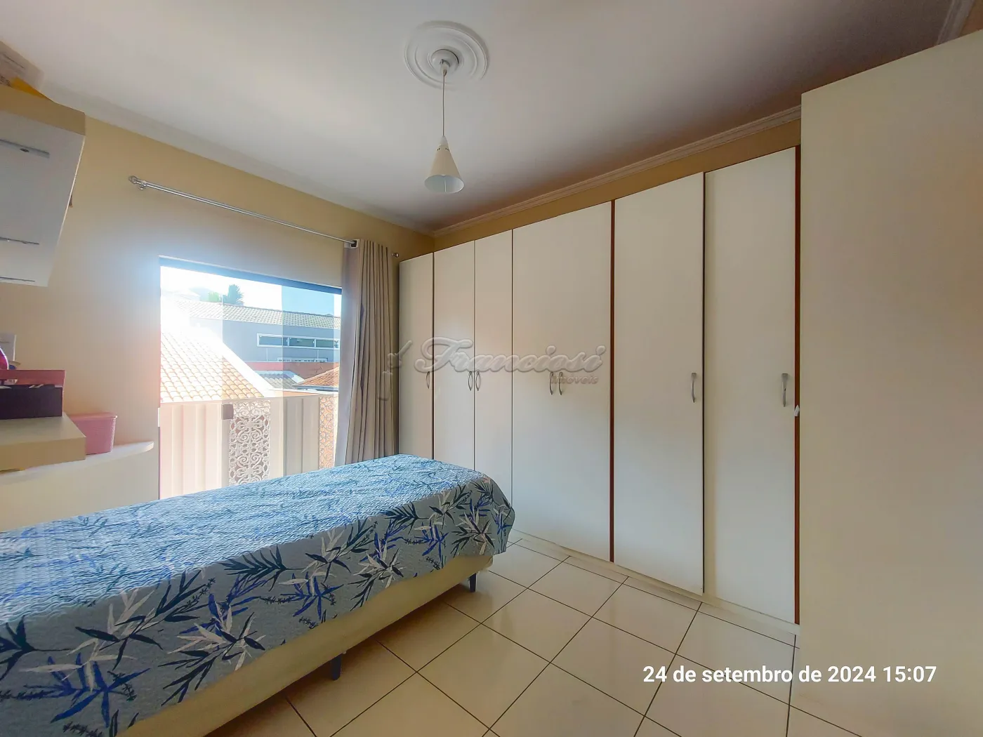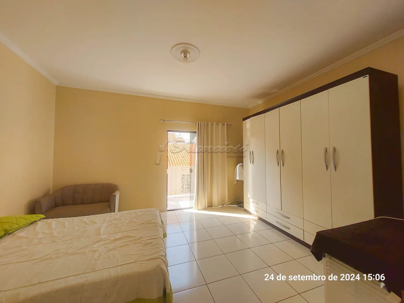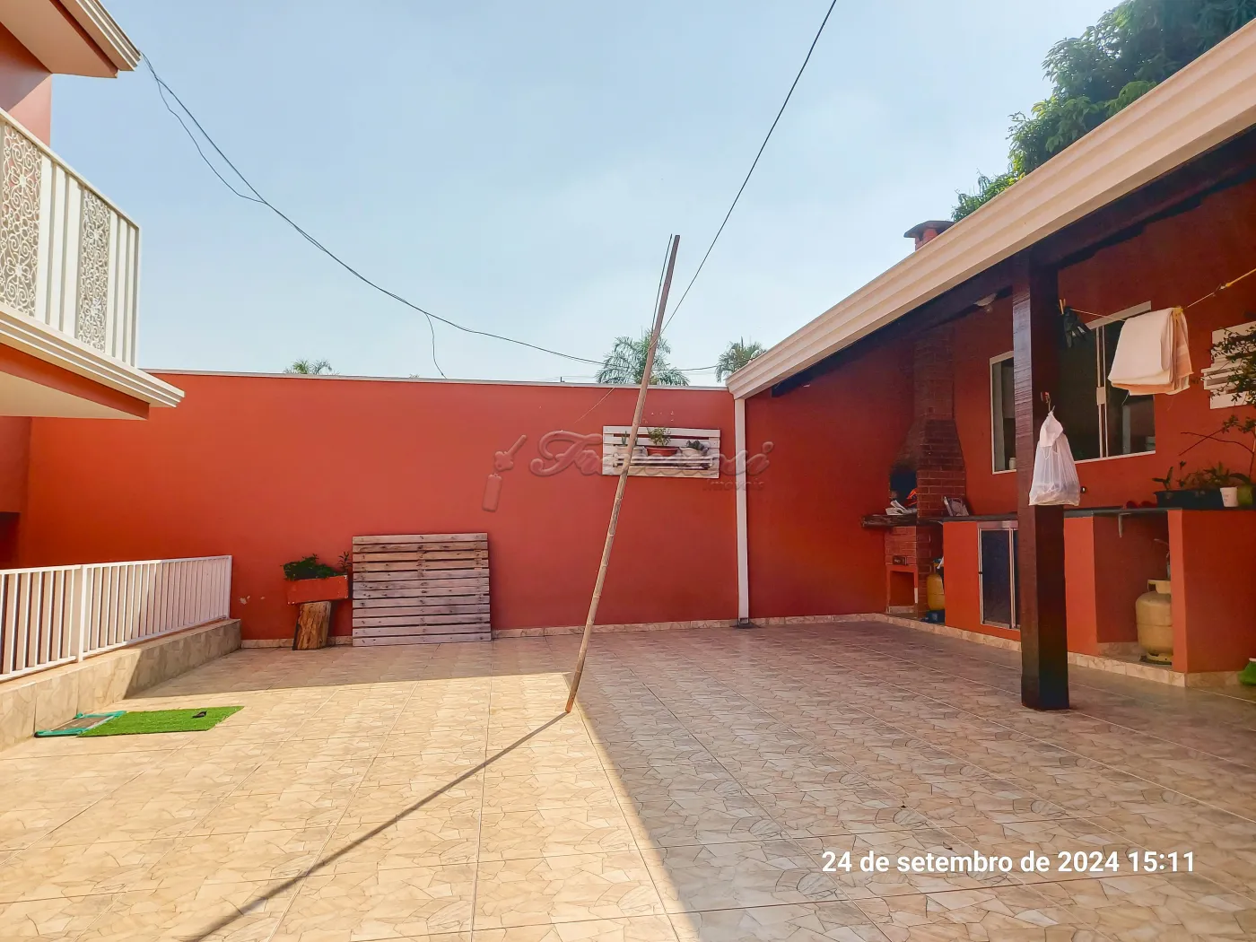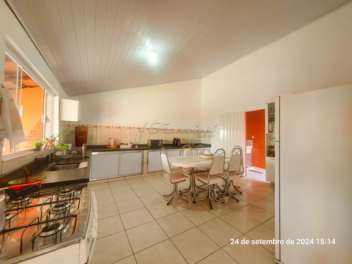 Parte inferior: Sala de estar, sala de jantar, cozinha planejada, lavabo, área de luz, quintal grande com churrasqueira. Edícula com 1 dormitório, cozinha grande e banheiro. Garagem coberta para 4 carros.