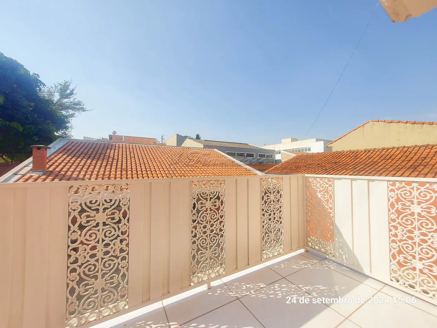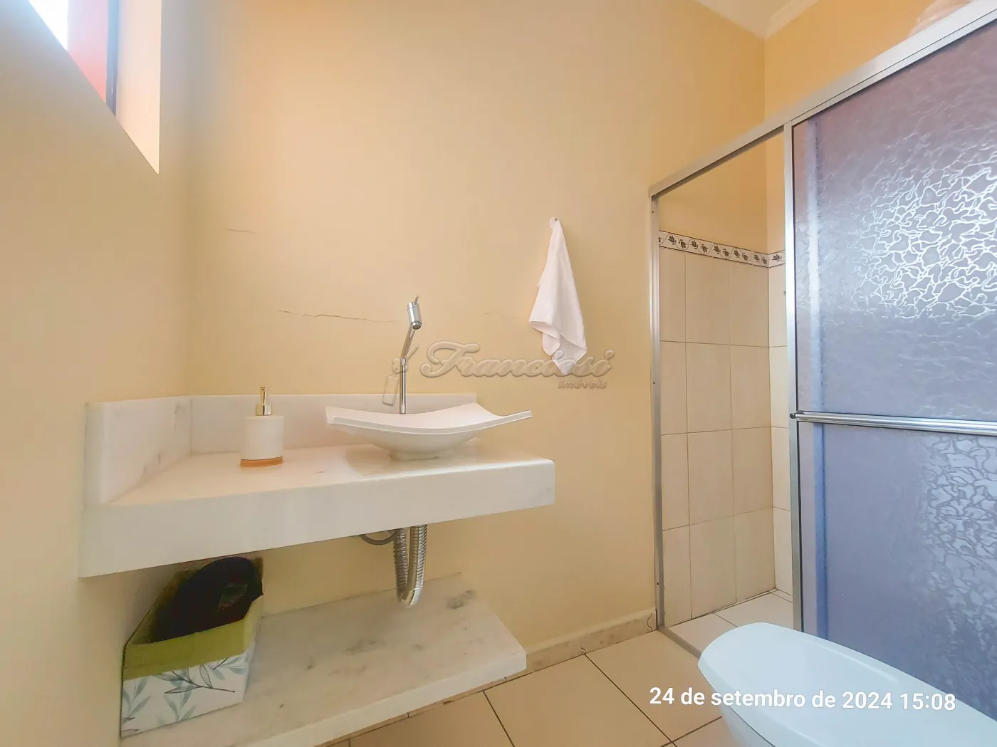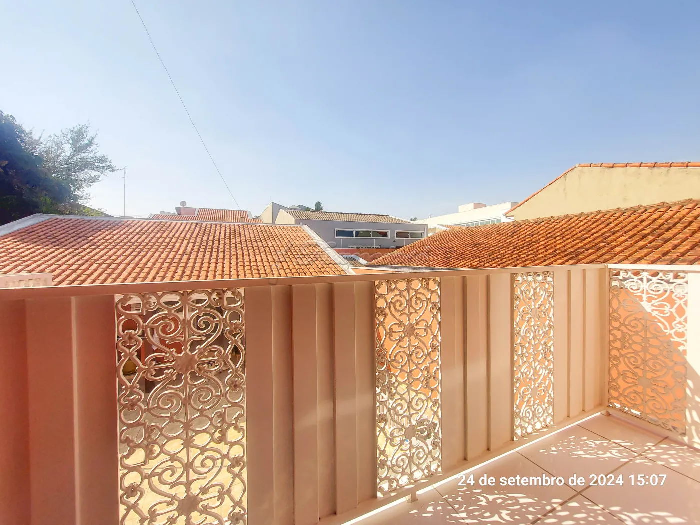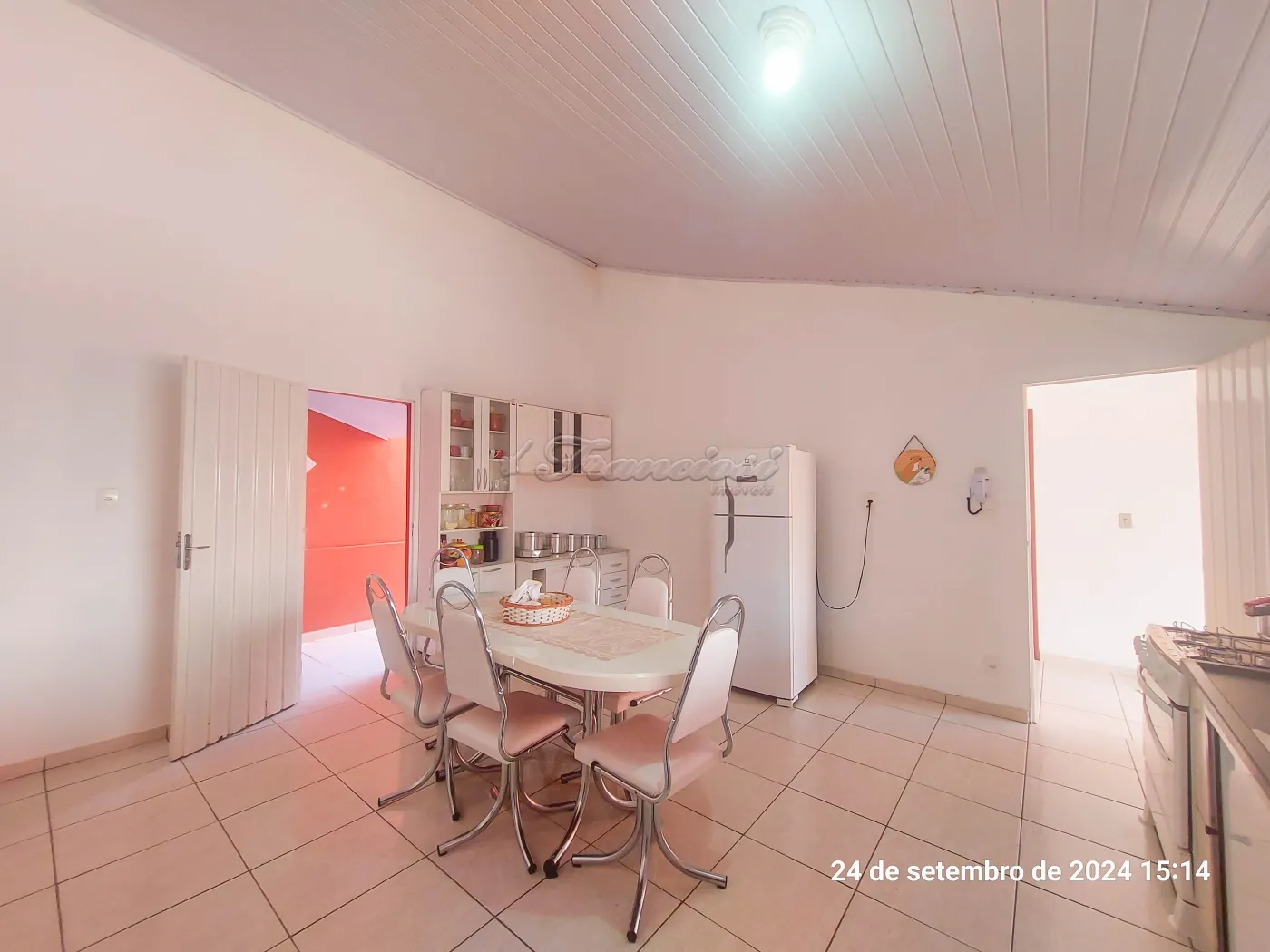 Parte inferior: Sala de estar, sala de jantar, cozinha planejada, lavabo, área de luz, quintal grande com churrasqueira. Edícula com 1 dormitório, cozinha grande e banheiro. Garagem coberta para 4 carros.