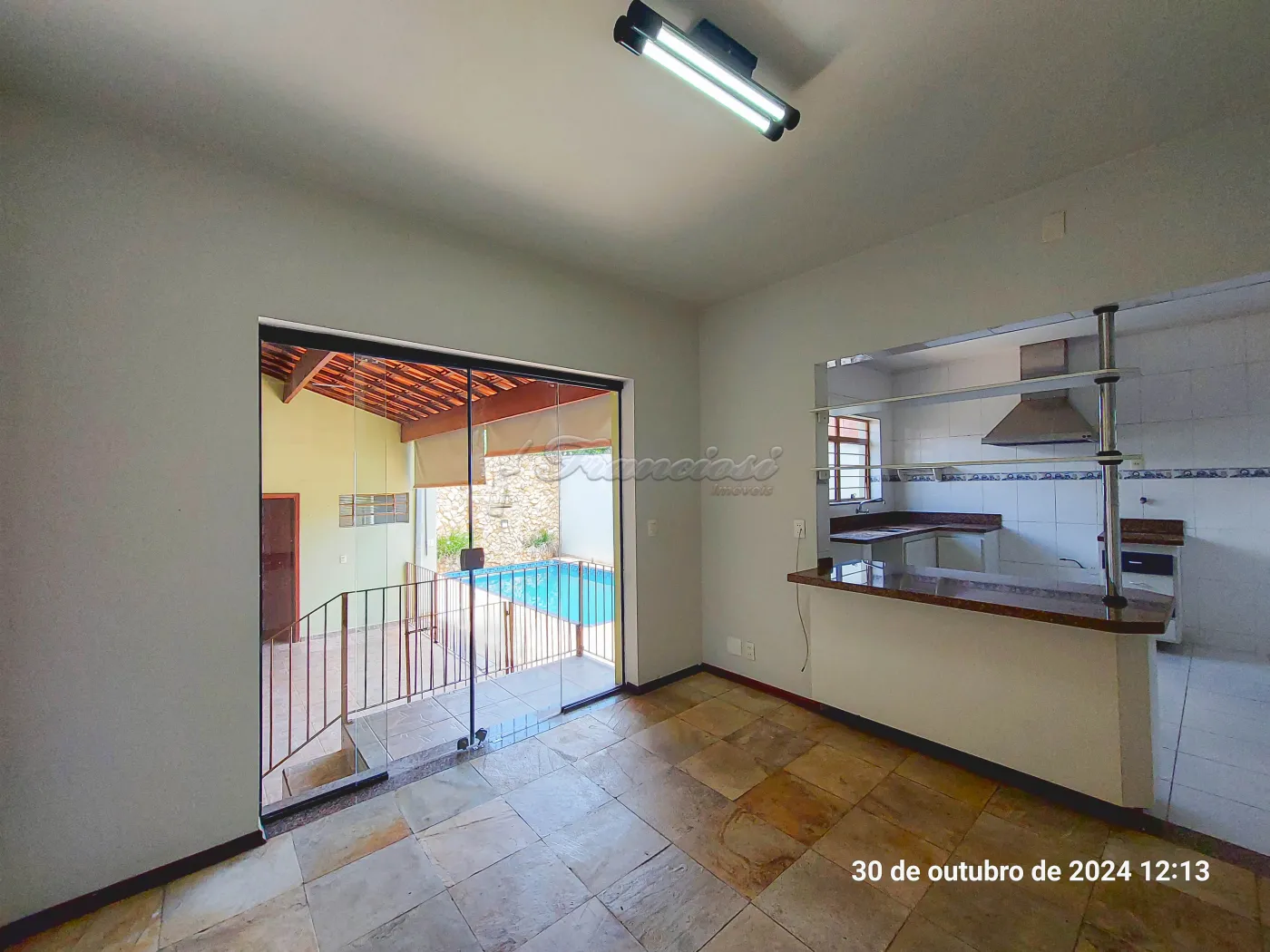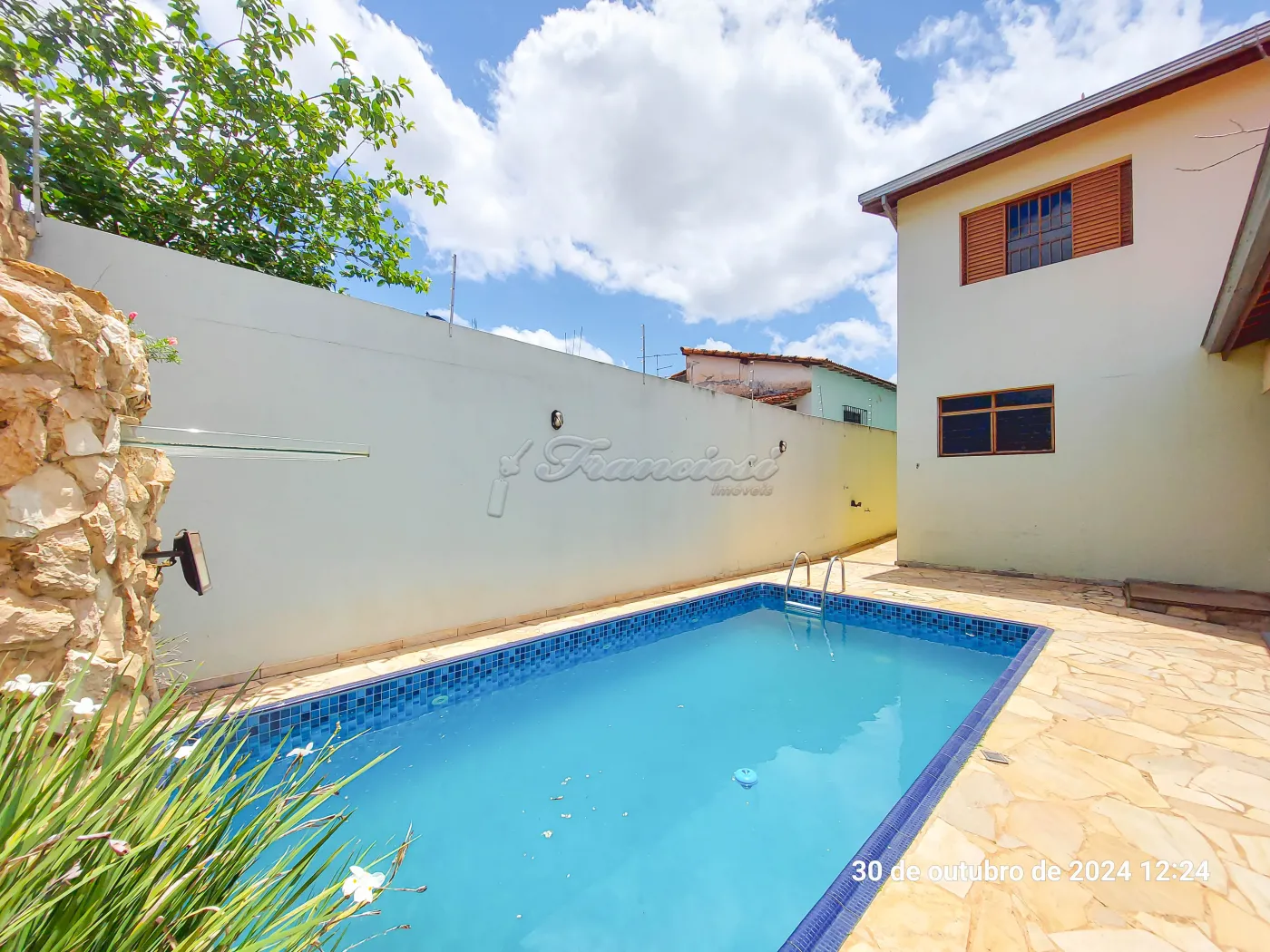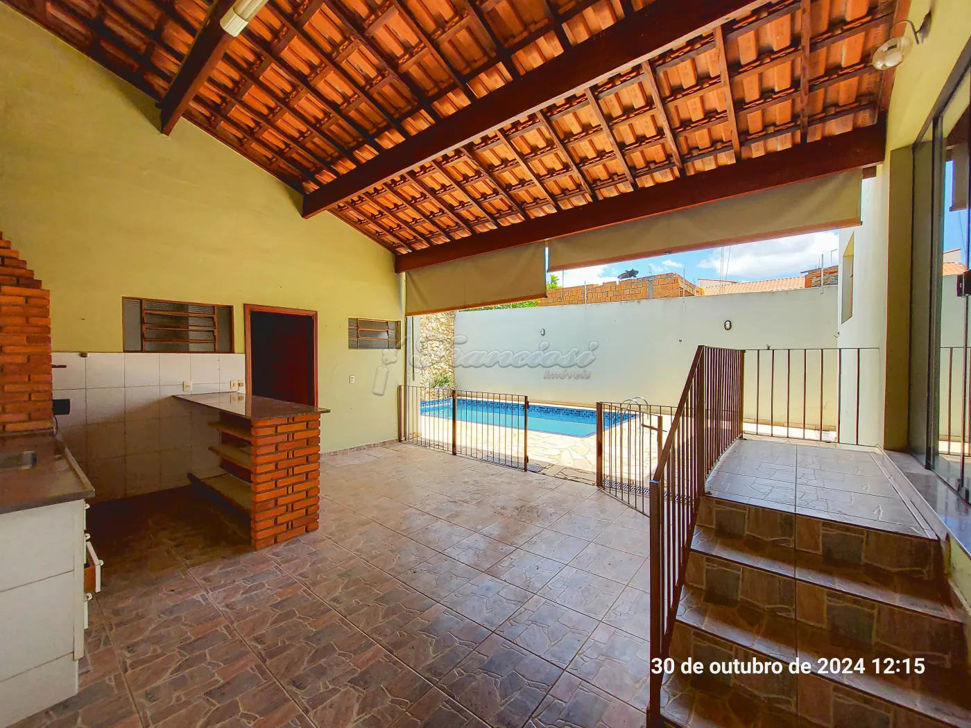 Parte inferior com sala de estar, sala de jantar, sala de tv, lavabo, cozinha, copa, despensa, área de lazer com churrasqueira, lavanderia, piscina, edícula com 1 cômodo e banheiro, quintal e garagem coberta para 2 carros.