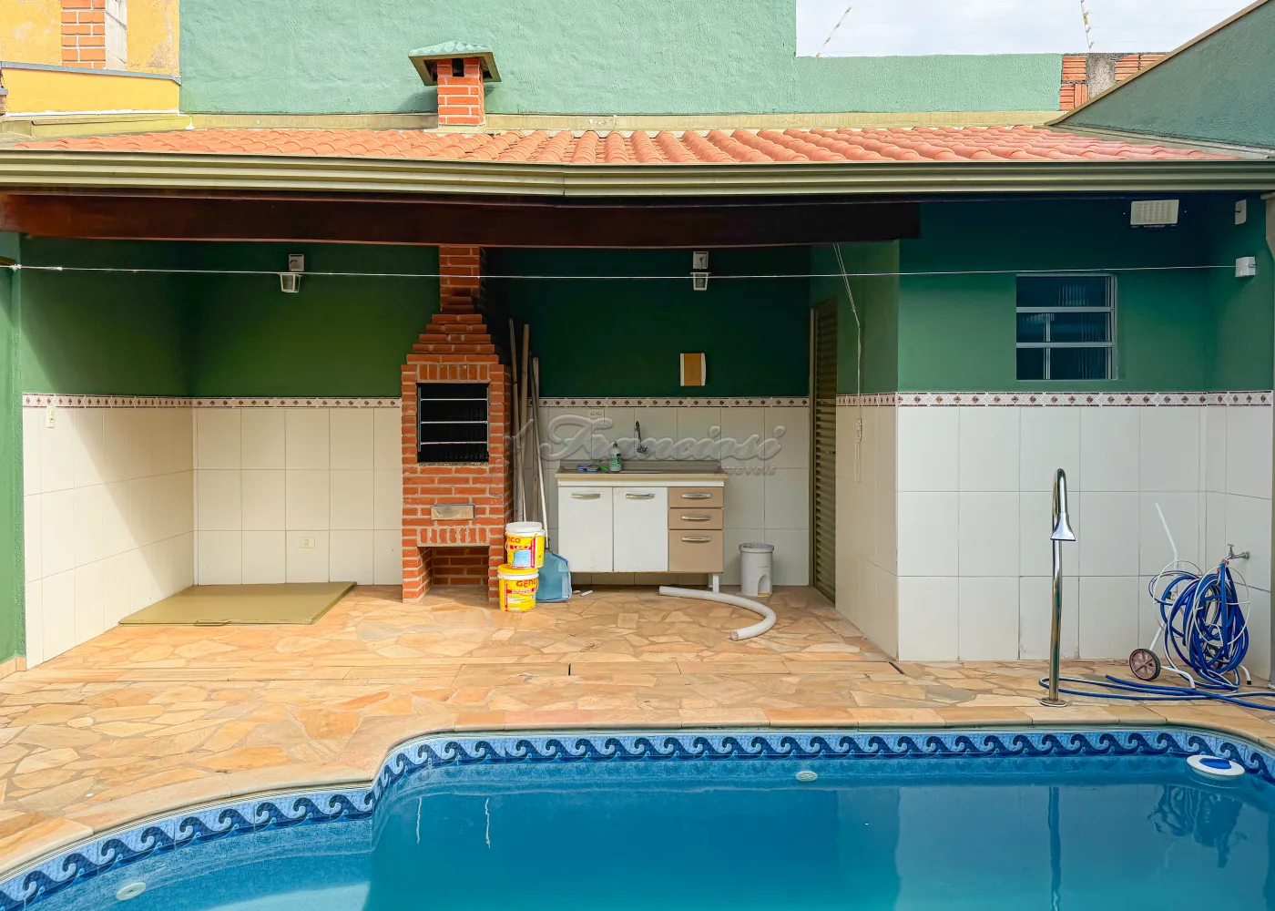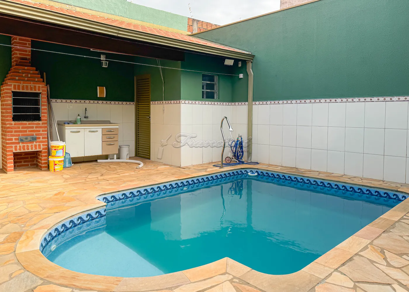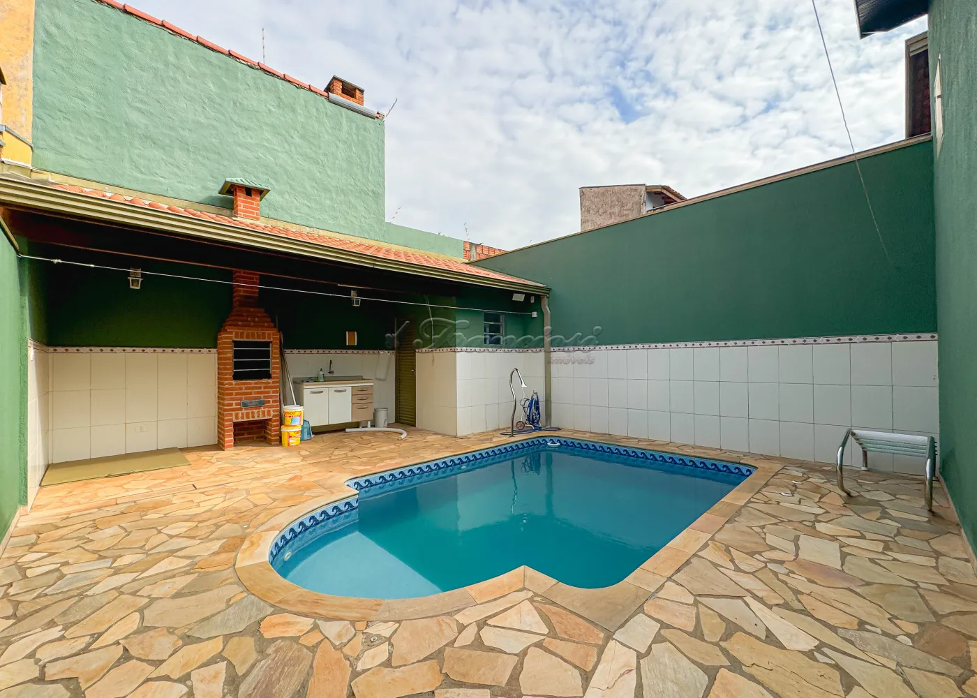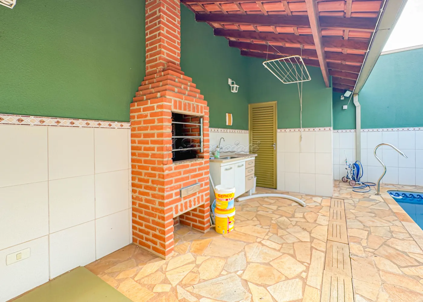 Casa com 3 dormitórios sendo 1 suíte, sala, cozinha, 1 banheiro social, edícula com churrasqueira, piscina, área de serviço e garagem para 1 carro.