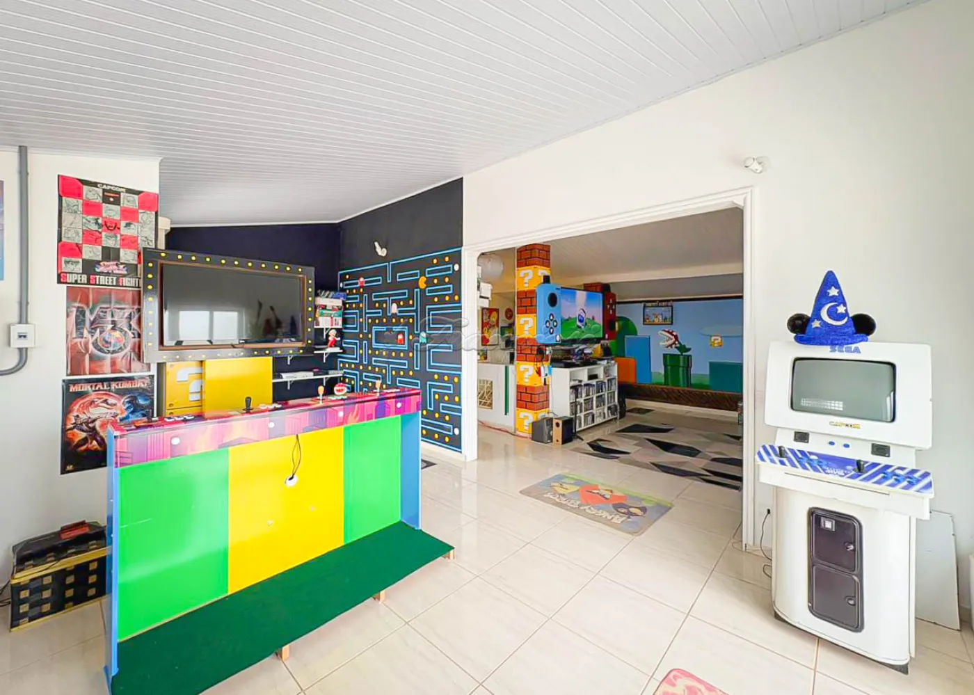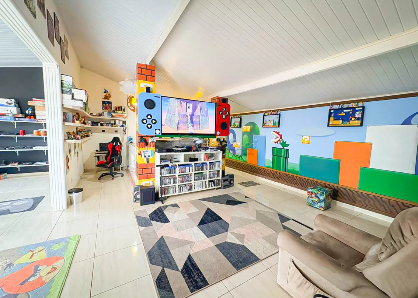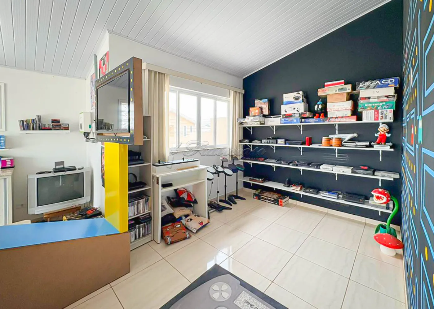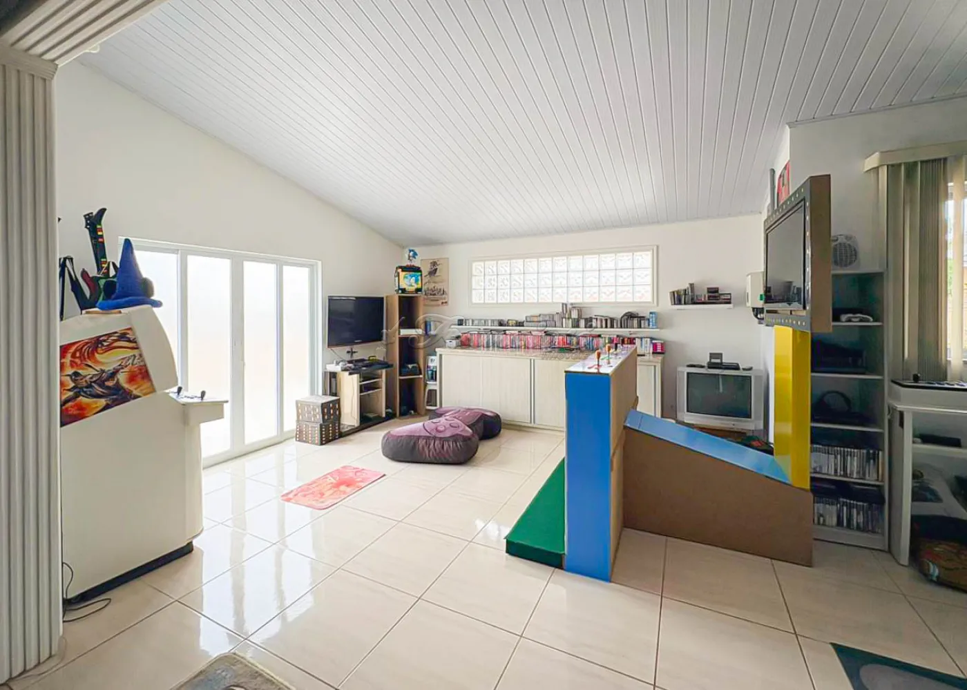 No piso superior, o imóvel dispõe de cômodo amplo, ideal para sala de jogos, home cinema ou outros usos, além de terraço grande.
