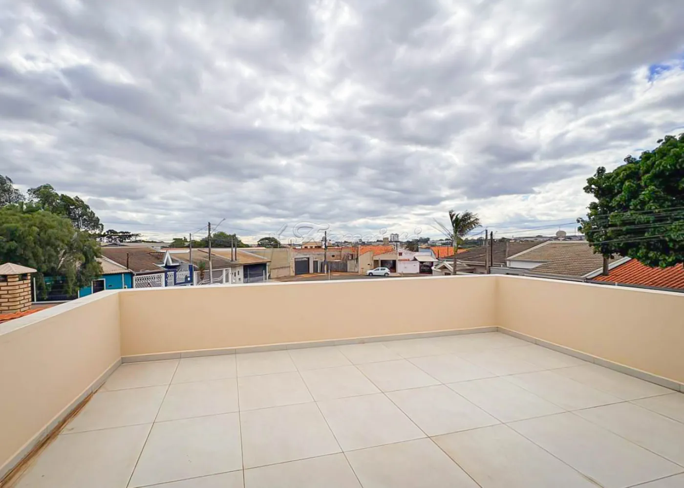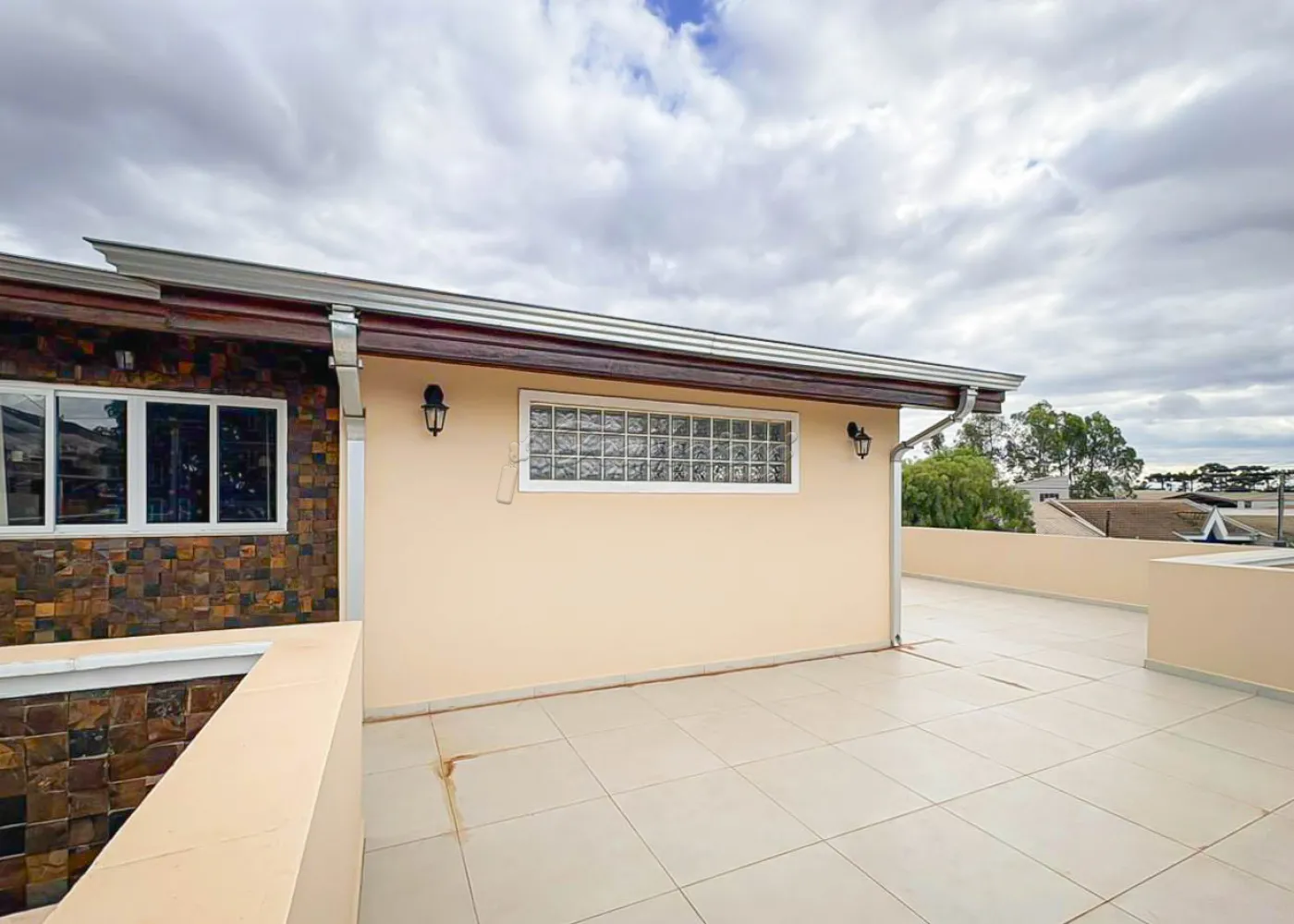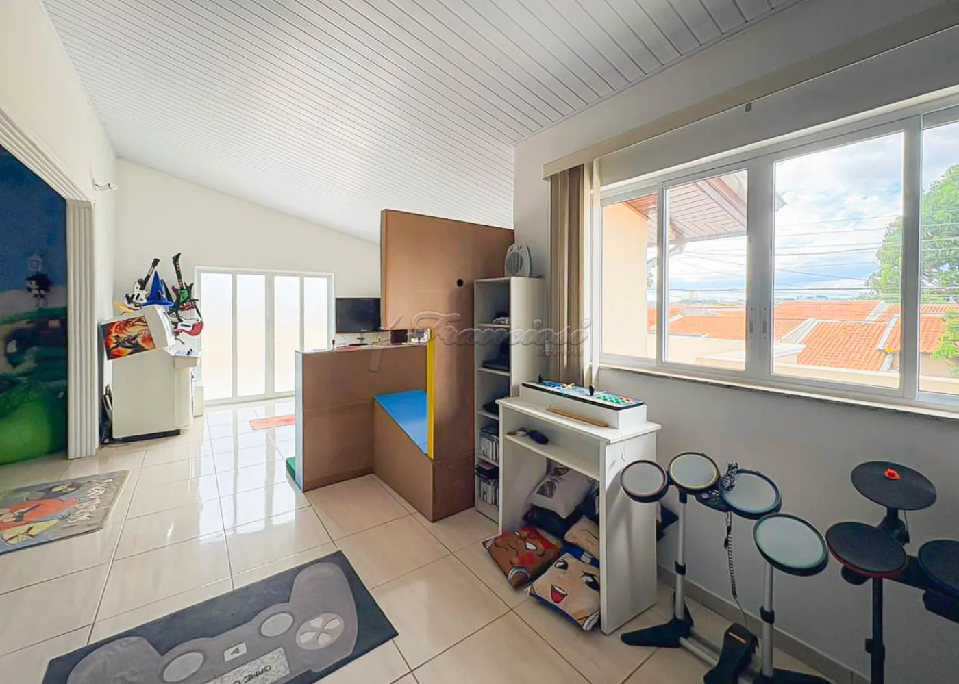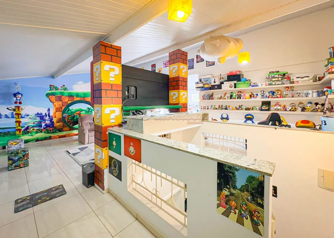 No piso superior, o imóvel dispõe de cômodo amplo, ideal para sala de jogos, home cinema ou outros usos, além de terraço grande.
