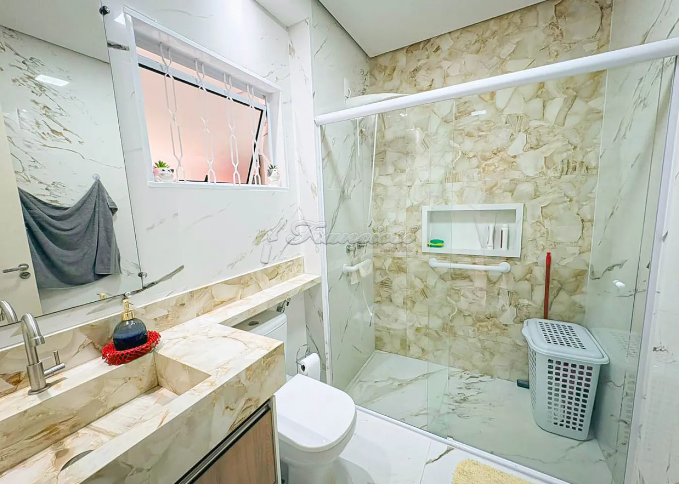 Acabamento: laje, porcelanato, forro em PVC no piso superior, placa solar, ar-condicionado e portão eletrônico.