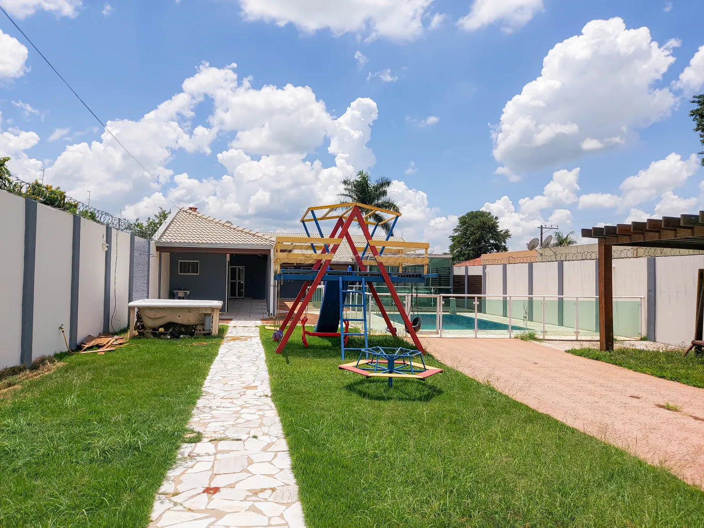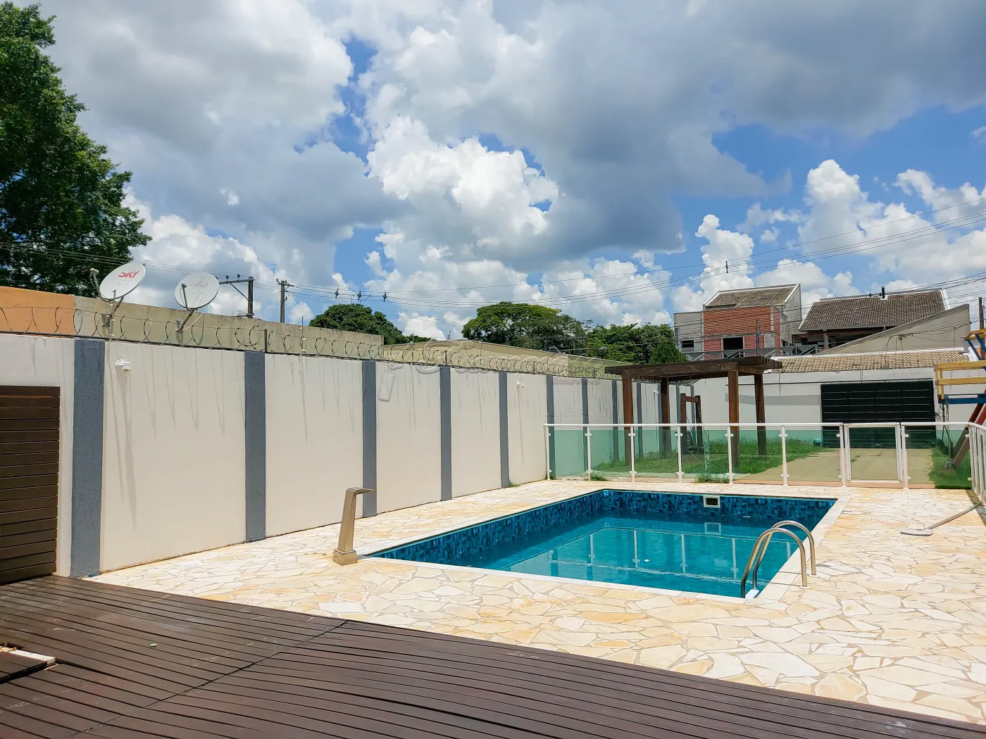 Casa com 2 dormitórios com armários modulados, hidromassagem fechada de vidro, 2 banheiros com box blindex, sala de estar ampla, cozinha externa, área de serviço coberta, 1 cômodo externo, quintal grande todo gramado com playground, 2 churrasqueiras com fogão á lenha, piscina com deck de madeira e vidro na lateral, entrada para vários carros. Cerca elétrica e Câmera.