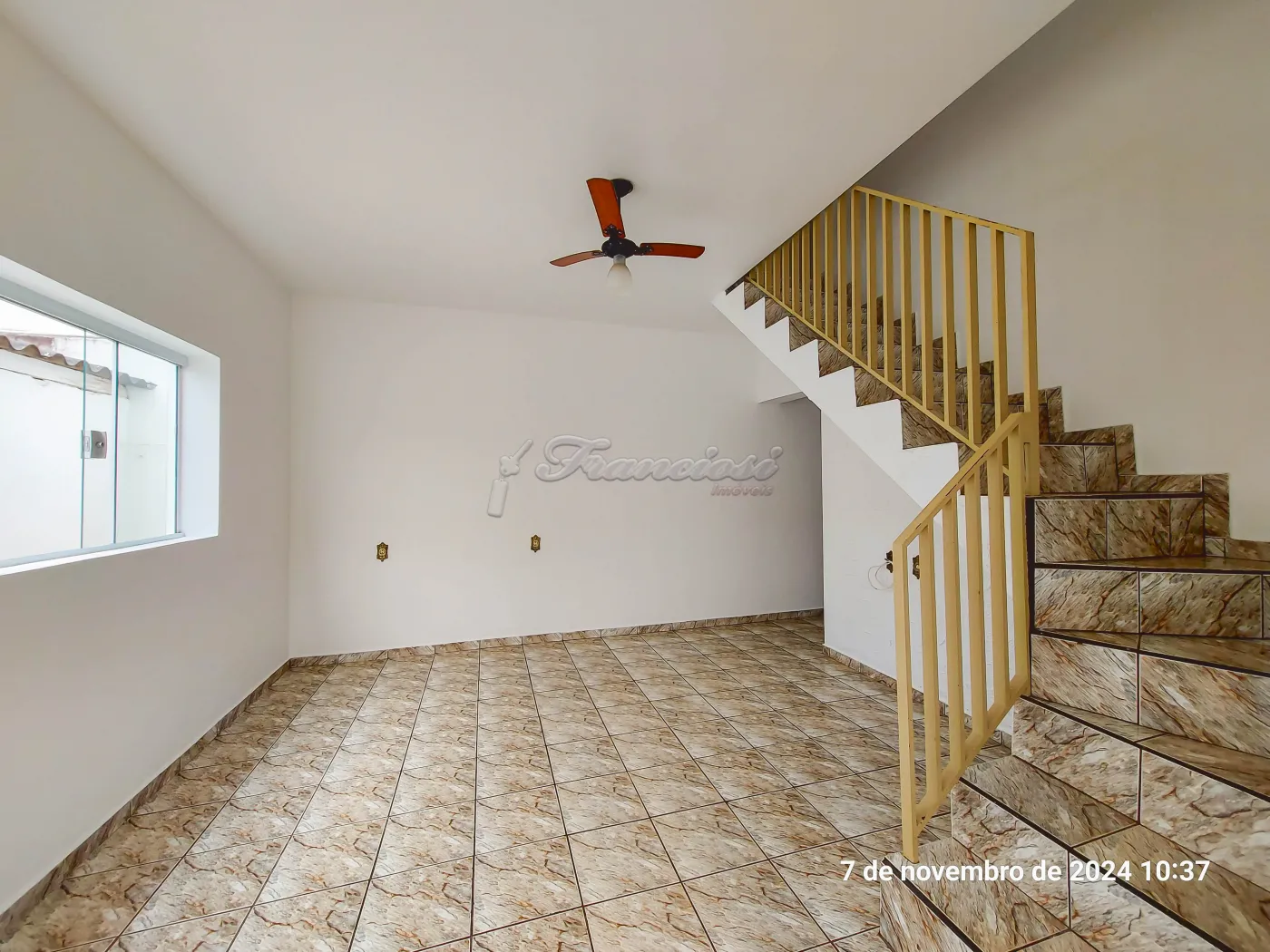 Parte inferior: sala de estar, sala de jantar, cozinha, 1 banheiro social com box de granito, canil e garagem para 2 carros com portão eletrônico.