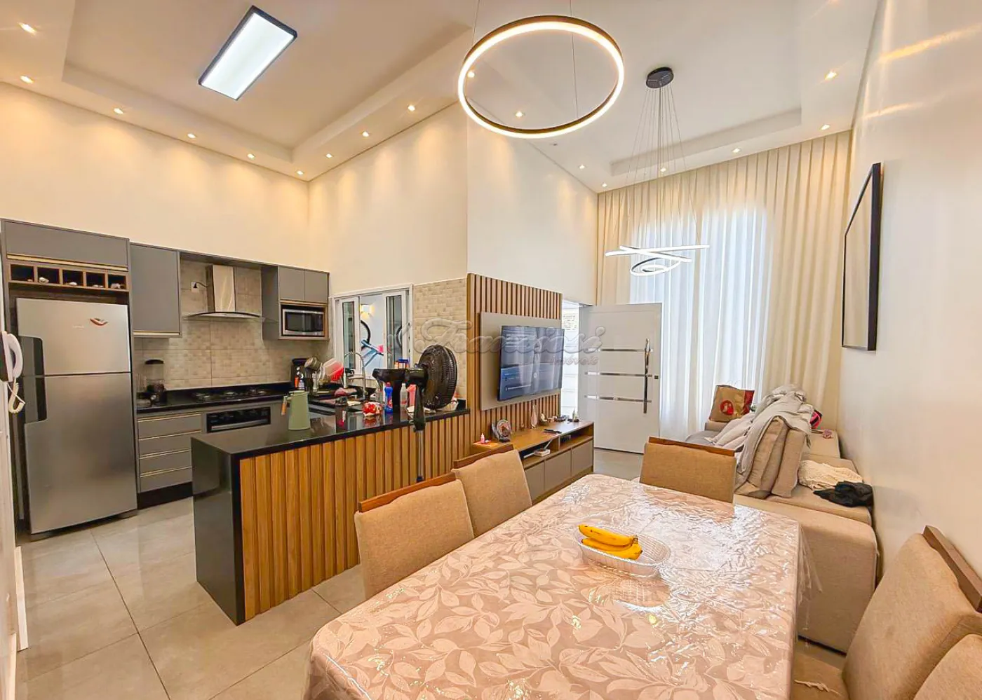Sala, cozinha e lavanderia integradas.