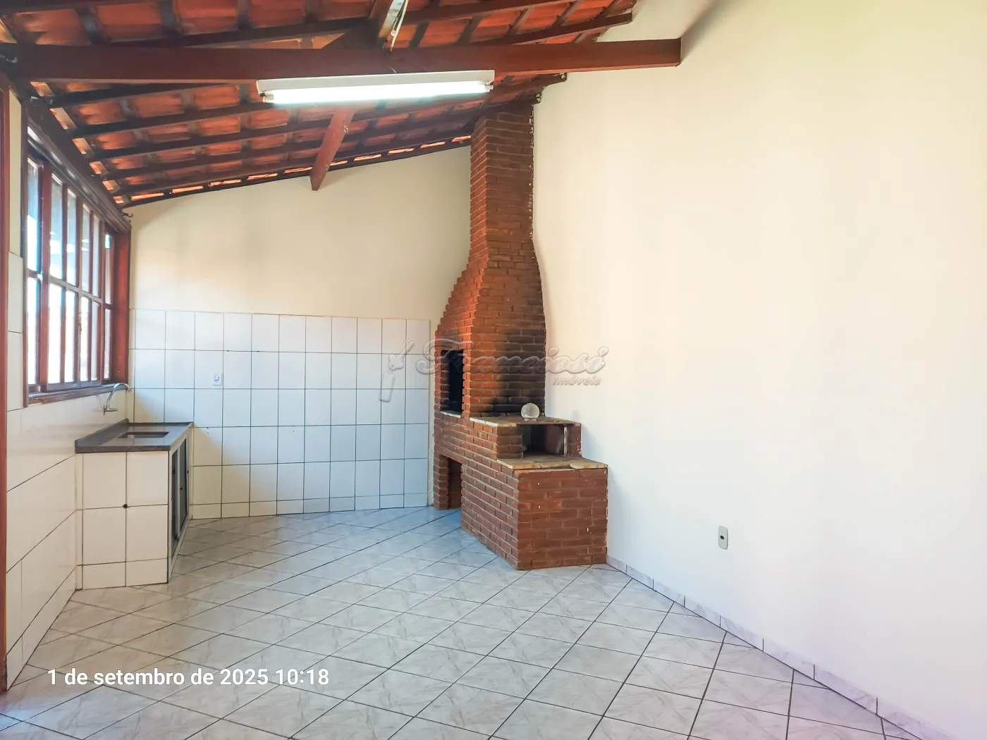 Casa com 4 dormitórios, sala de estar, cozinha, 1 banheiro social, área de serviço, quintal, churrasqueira e garagem para vários carros.