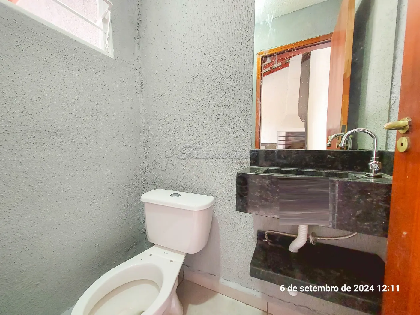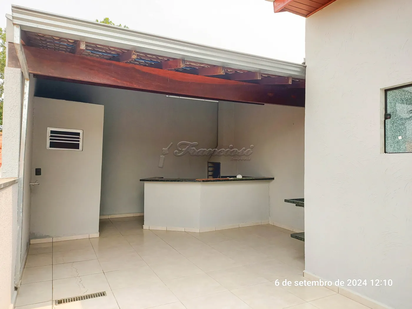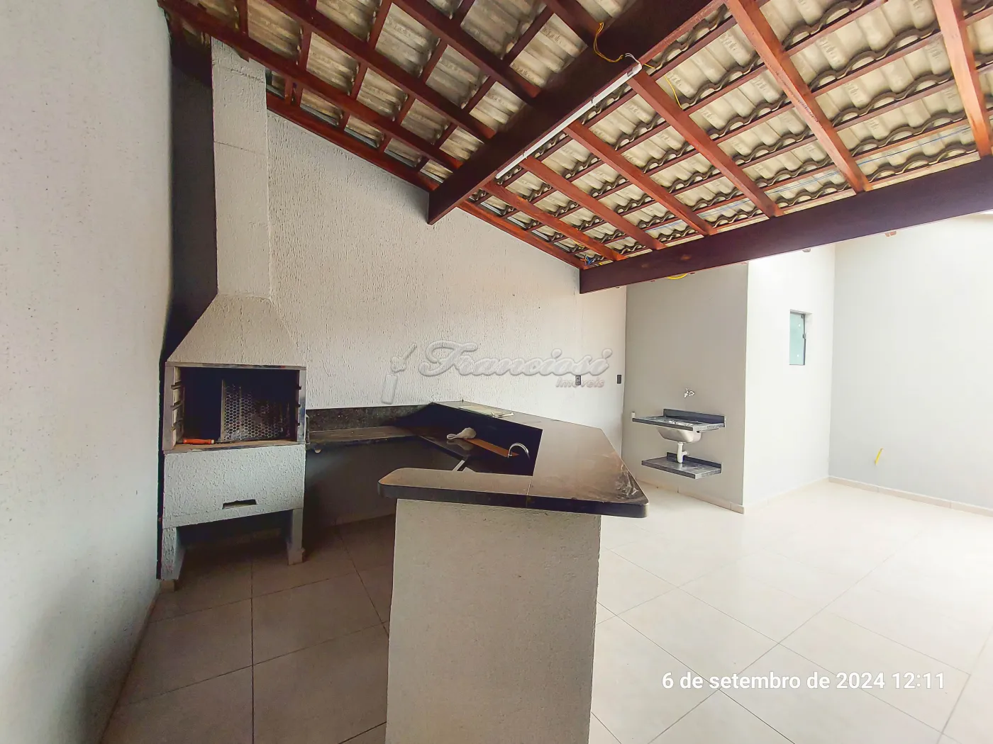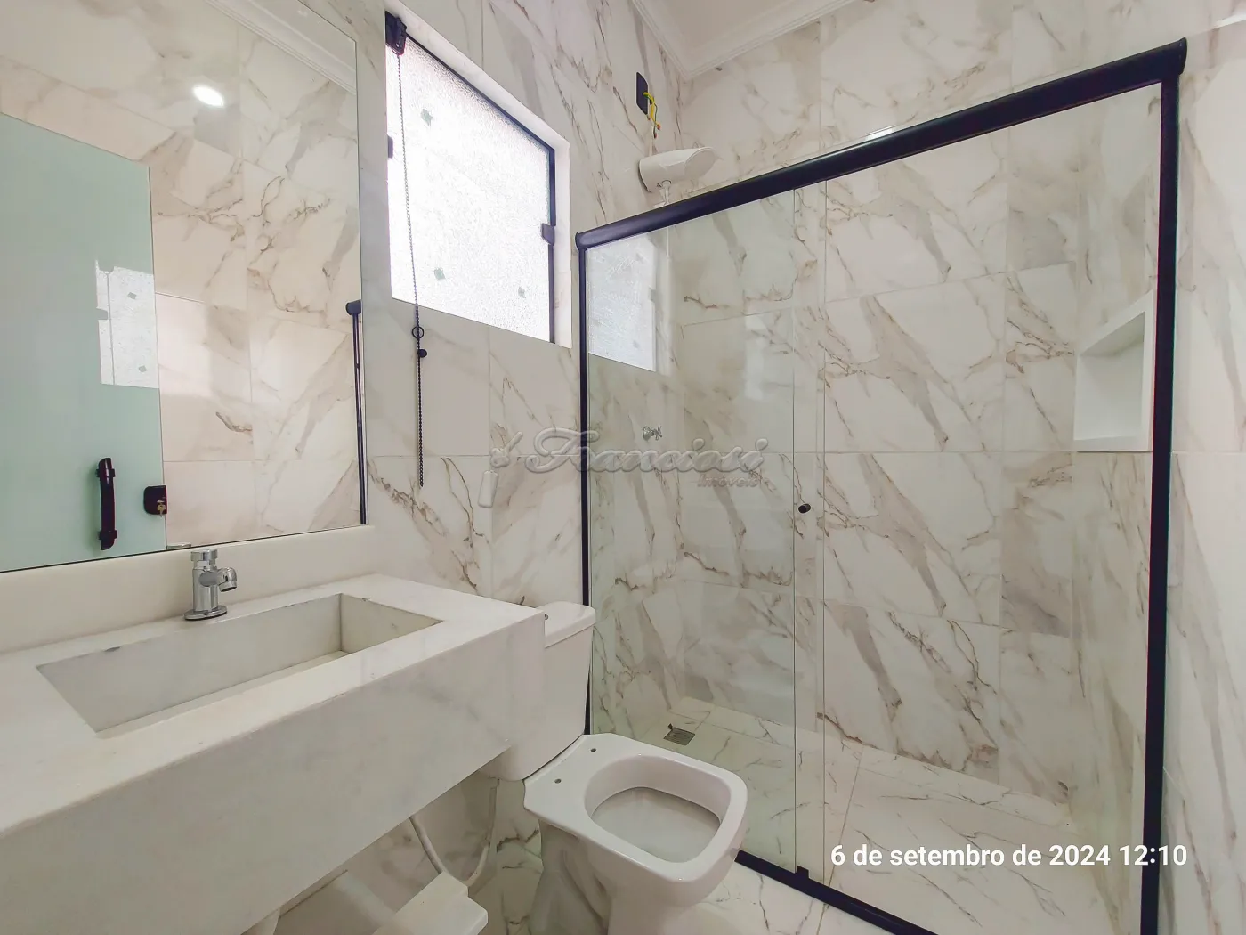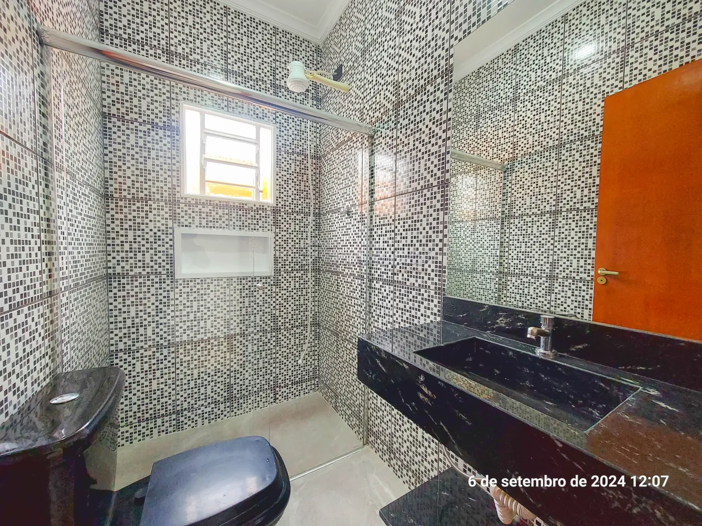 Casa com 3 dormitórios sendo 1 suíte com box blindex, sala, cozinha com armários e mesa, 1 banheiro social com box blindex, quintal, área de lazer com churrasqueira, 1 banheiro externo, área de serviço e garagem coberta para 1 carro com portão eletrônico.