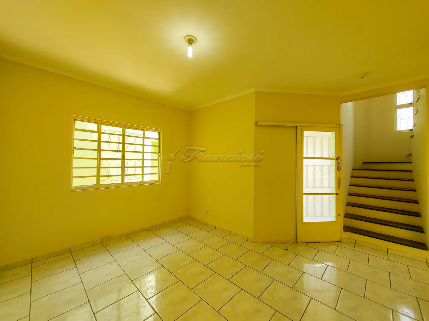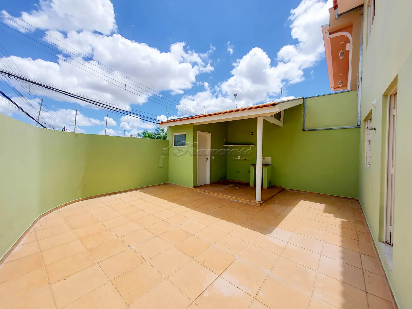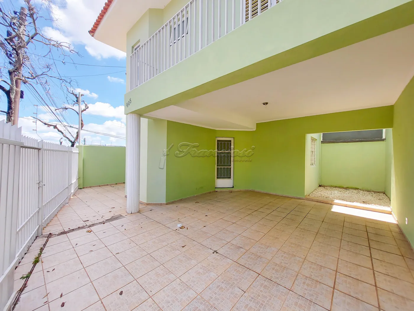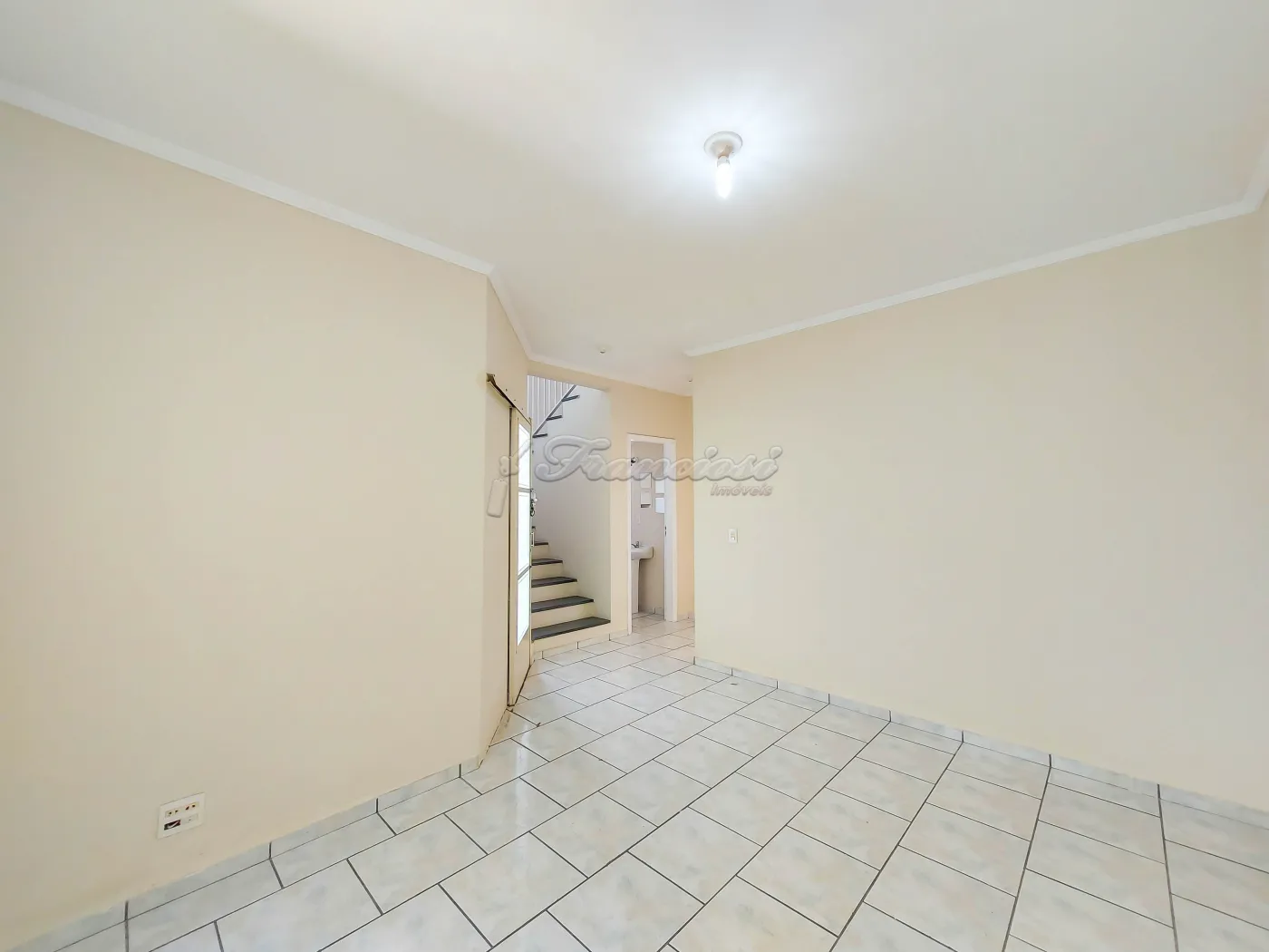 Sobrado com 3 dormitórios sendo 1 suíte, 1 banheiro social, sala de estar, cozinha, área de serviço, 1 banheiro externo, quintal médio com piso e garagem coberta para 2 carros, portão de grade vazado.