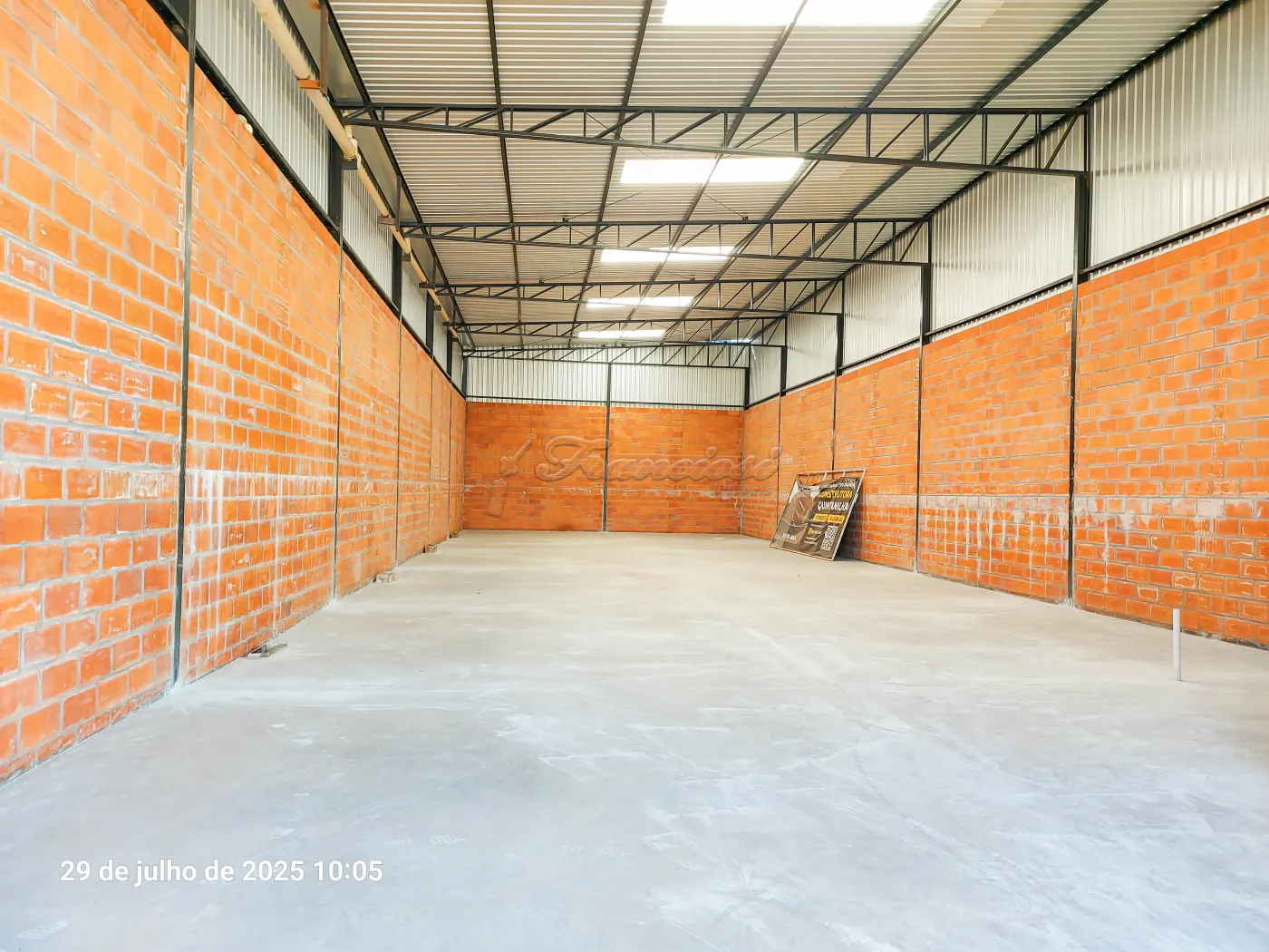 Barracão sem divisórias, com mezanino, corredor lateral, recuo para estacionamento e área ampla aos fundos. Acabamento: blocos de cimento, chão cimentado e estrutura metálica no teto.