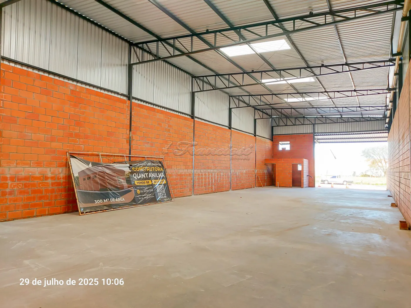 Barracão de Alvenaria com mezanino, 2 banheiros e cozinha. Com estrutura metálica e piso de concreto, suporta peso de caminhões. 5,5 x 11,15 estacionamento 1 10,60 x 40,80 edificação 14,30 x 10,37 estacionamento 2 10,40 x 4,65 mezanino com cobertura telha sanduíche Captação de água da chuva com capacidade de 10000 litros sendo caixa d`água 5000 litros + cisterna 5000 litros Banheiros completos e azulejados Copa azulejada Instalação elétrica trifásico com luzes de emergência com registro no CRE. Lanternim com iluminação e ventilação diretas. Rastreio via Internet 24 horas com 6 câmeras. Piso concreto usinado com capacidade para receber cargas acima de 50 toneladas. Duas Frentes: para rodovia Raposo Tavares ( portão eletrônico + porta blindex 3,50 x 3,20) + Estrada Municipal José Correia de Moraes (com portão automático dobrável com 6,70 x 4,30) Pé direito de 7,50 m Alvará de bombeiros 4 extintores Documento com matrícula registrada no RI de Itapetininga