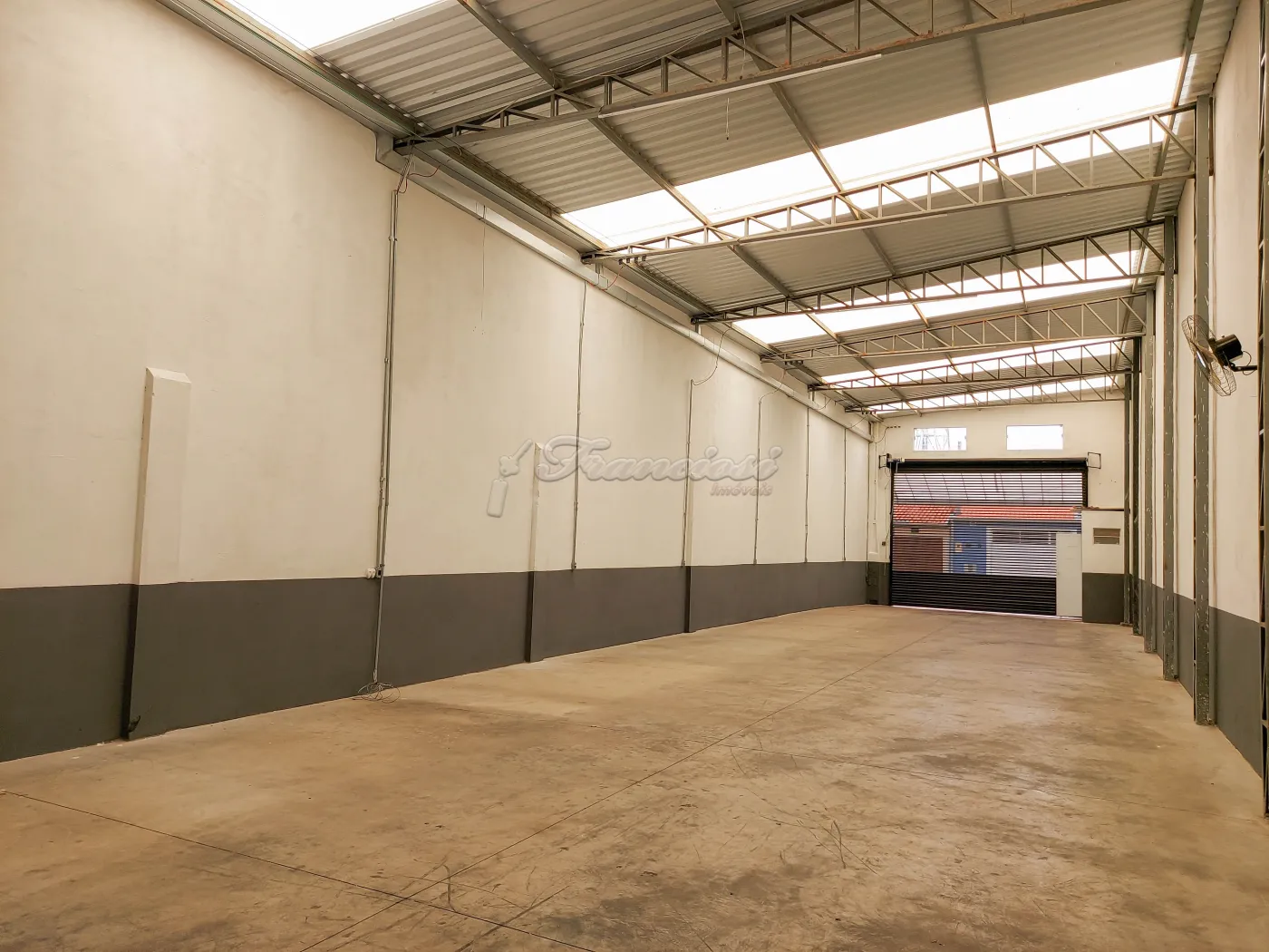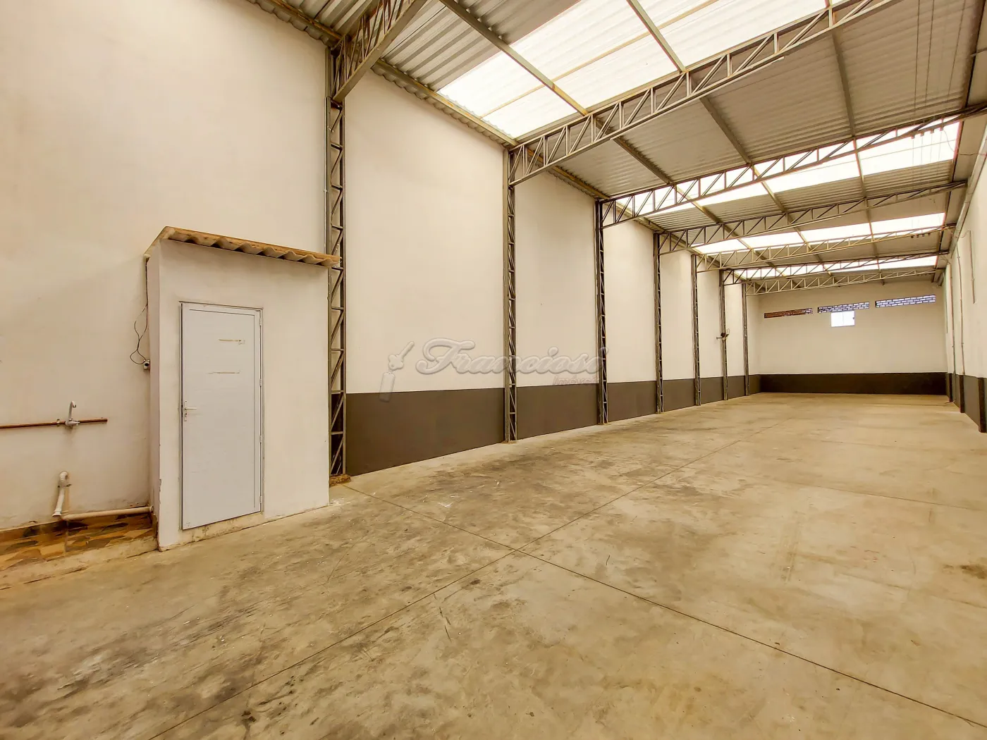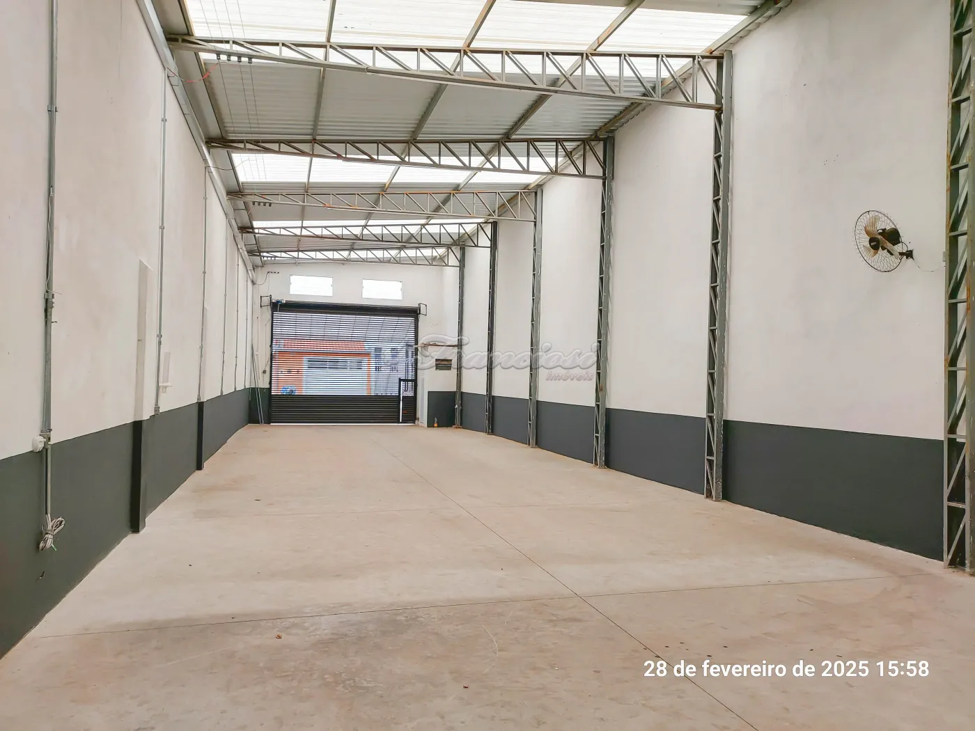 Barracão com banheiro e porta eletrônica.