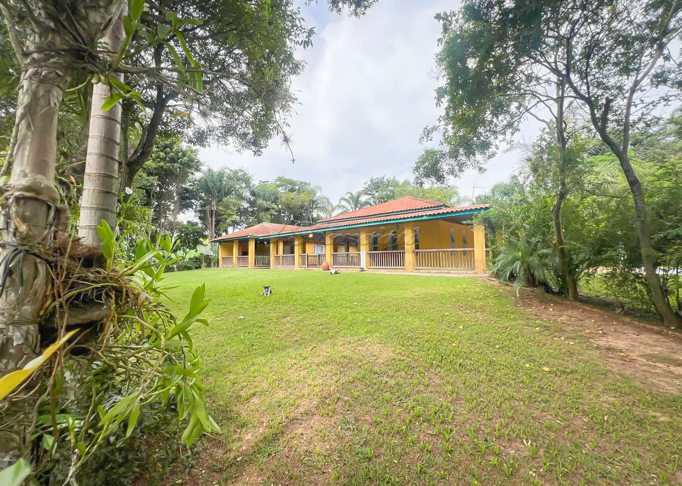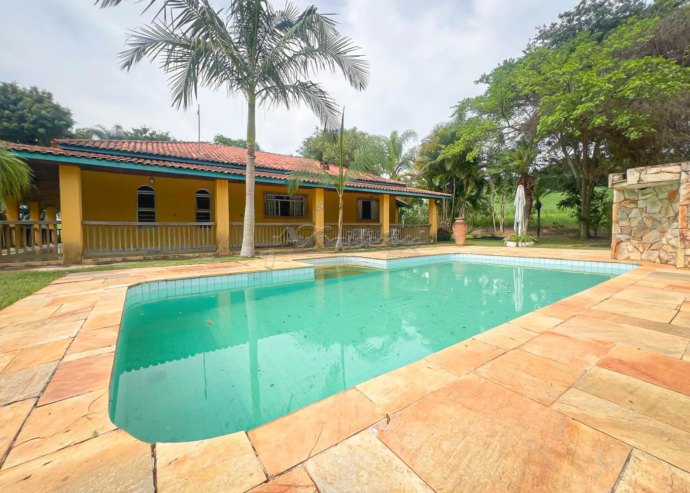 Área total de 5.000 m² e área construída de 800 m². Casa sede com 4 Dormitórios sendo 2 suítes, sala de estar, sala de tv, copa, cozinha, escritório, varanda, piscina, cozinha mineira, 4 banheiros e garagem para 4 carros. Acabamento: teto laje e piso frio. Pomar e água da sabesp.