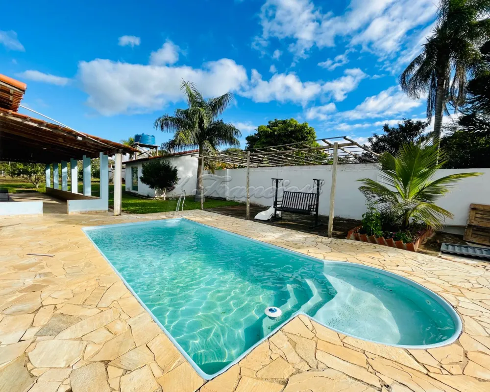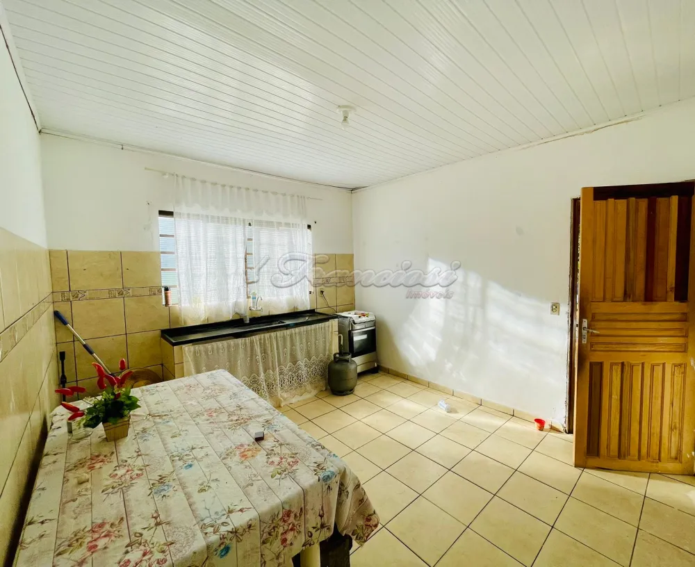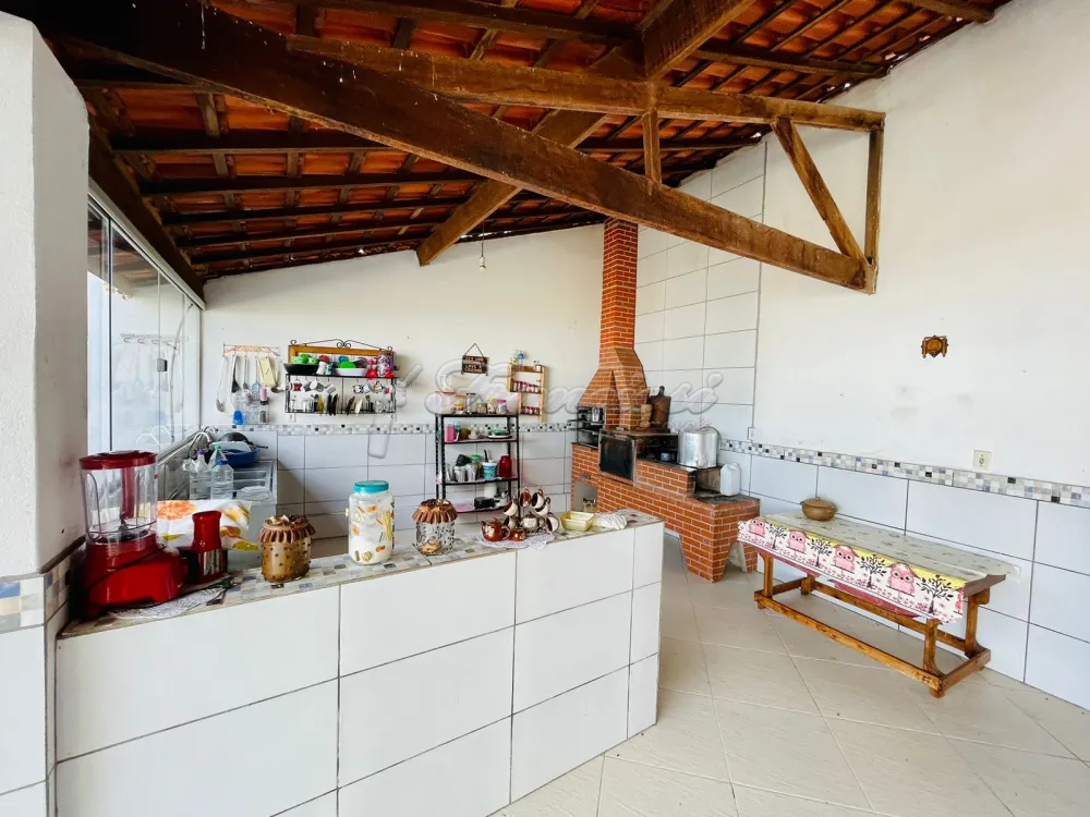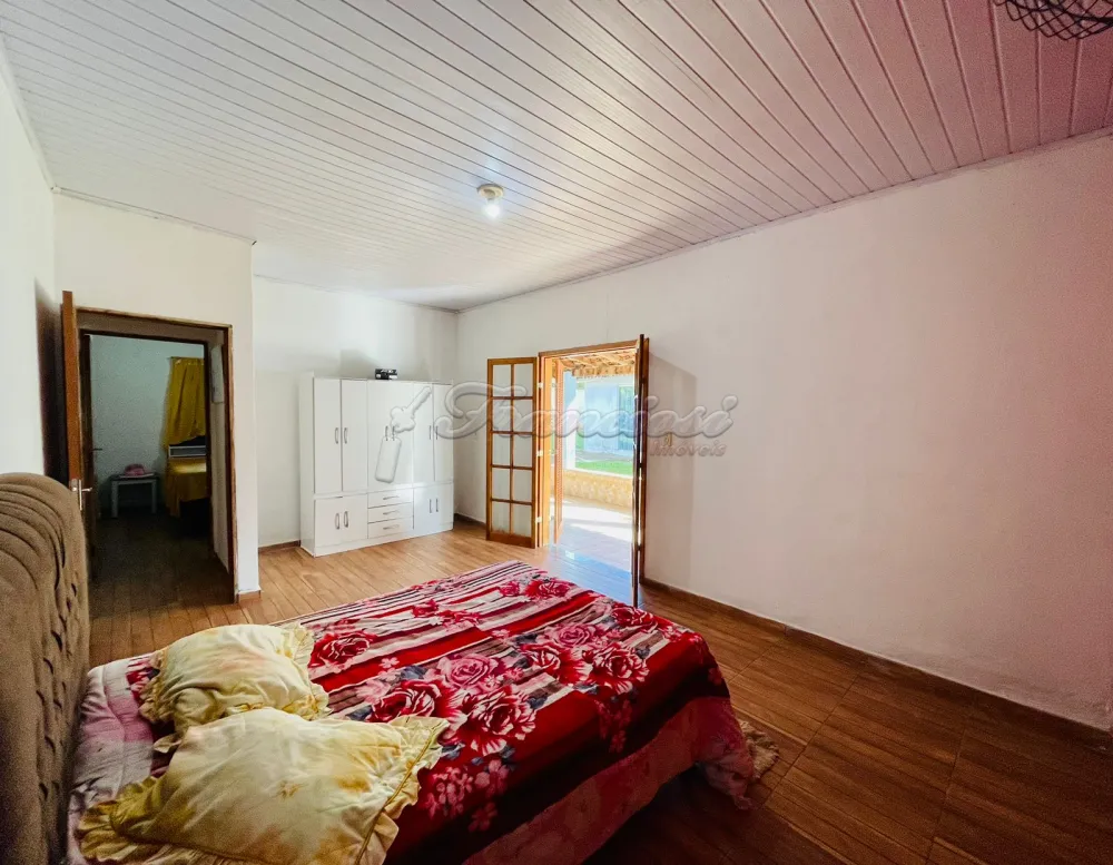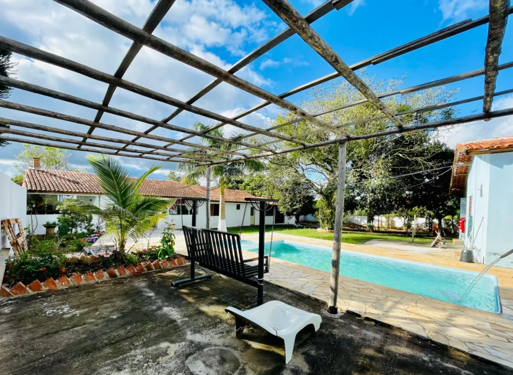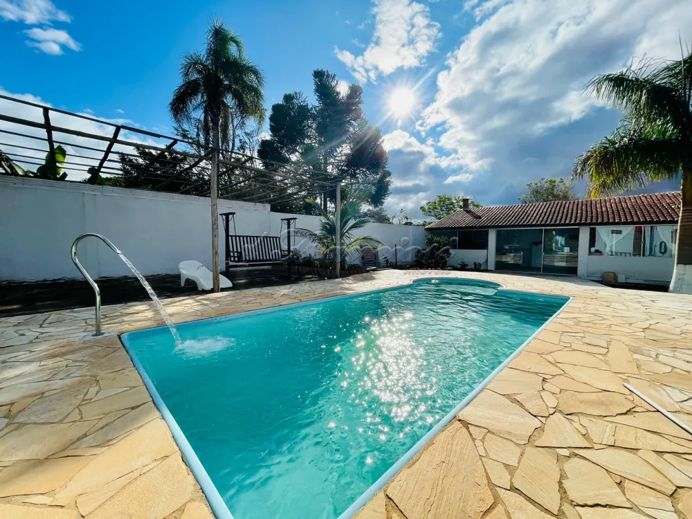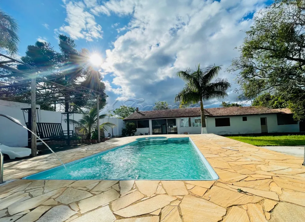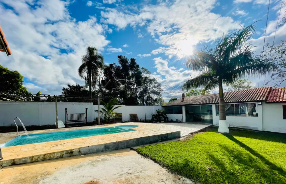 Casa com 3 dormitórios sendo 1 suíte, sala, cozinha, 1 banheiro social, área de serviço, varanda com churrasqueira, piscina, 1 banheiro externo. Nos fundos: 1 dormitório, 1 banheiro e despensa. Entrada para vários carros.