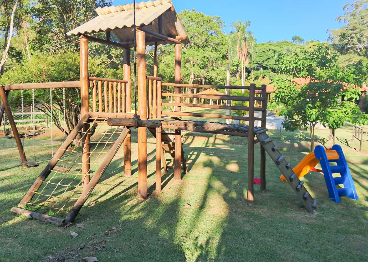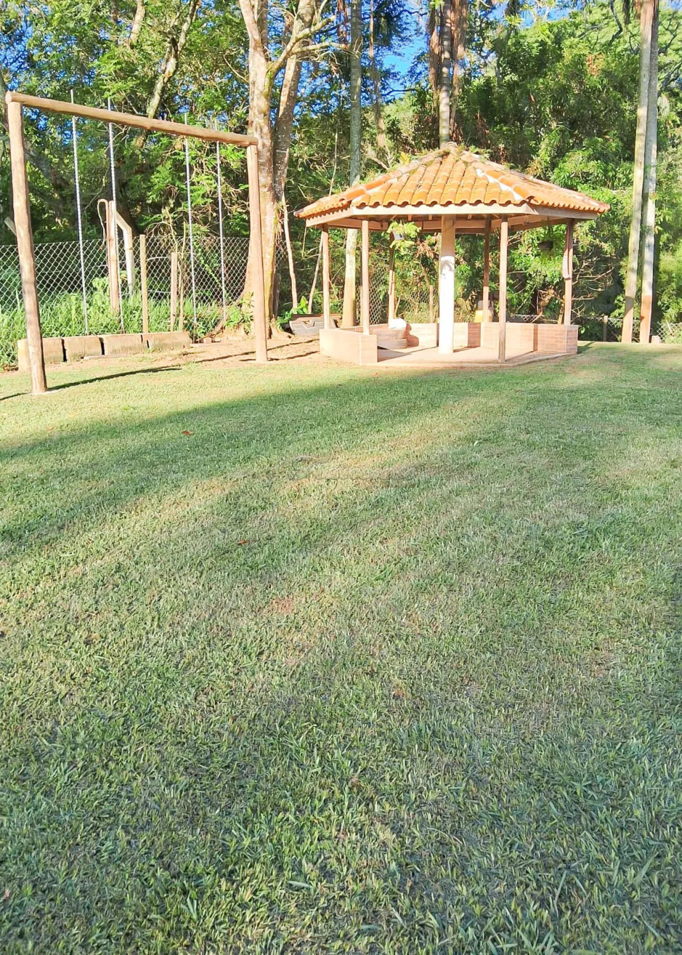 Quintal amplo e gramado, com árvores, jardim e parquinho infantil.