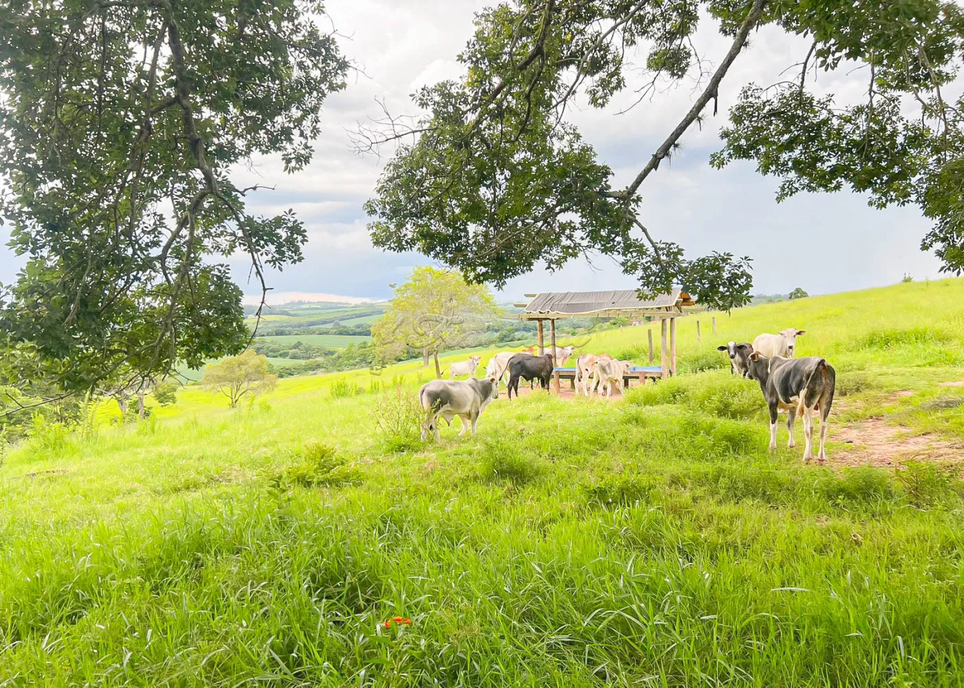Conta com ampla área gramada com pergolado de madeira, barracão, garagem coberta para 04 veículos, múltiplas entradas de acesso e estrutura para criação de gado, com cochos para alimentação.