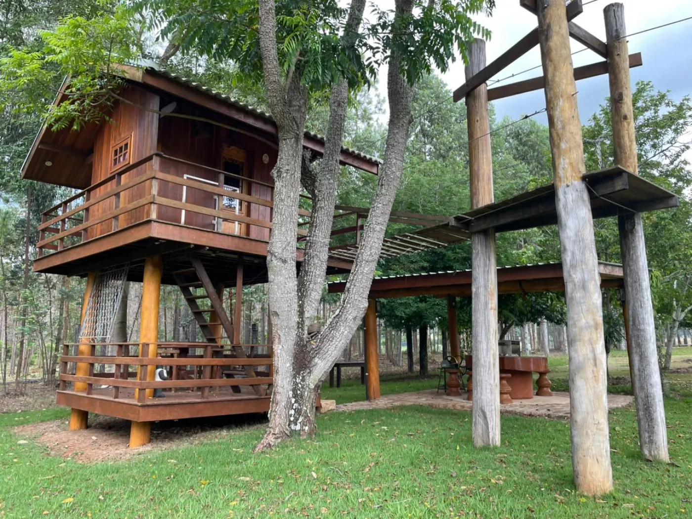 Chalé localizado em uma casa da árvore, complementado por uma tirolesa, ideal para momentos de lazer.