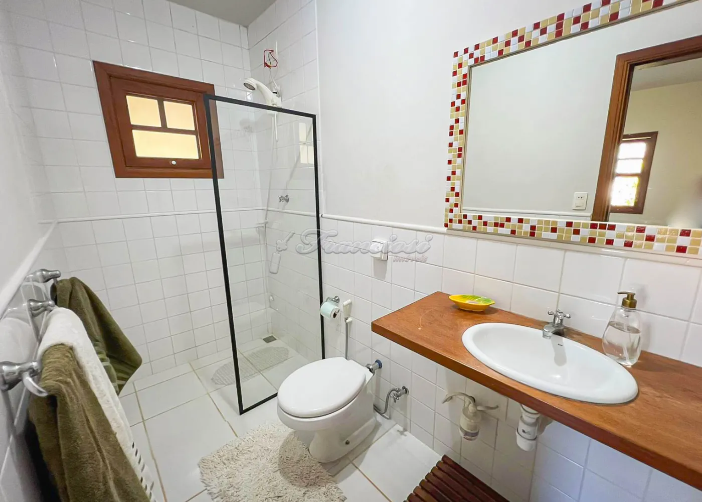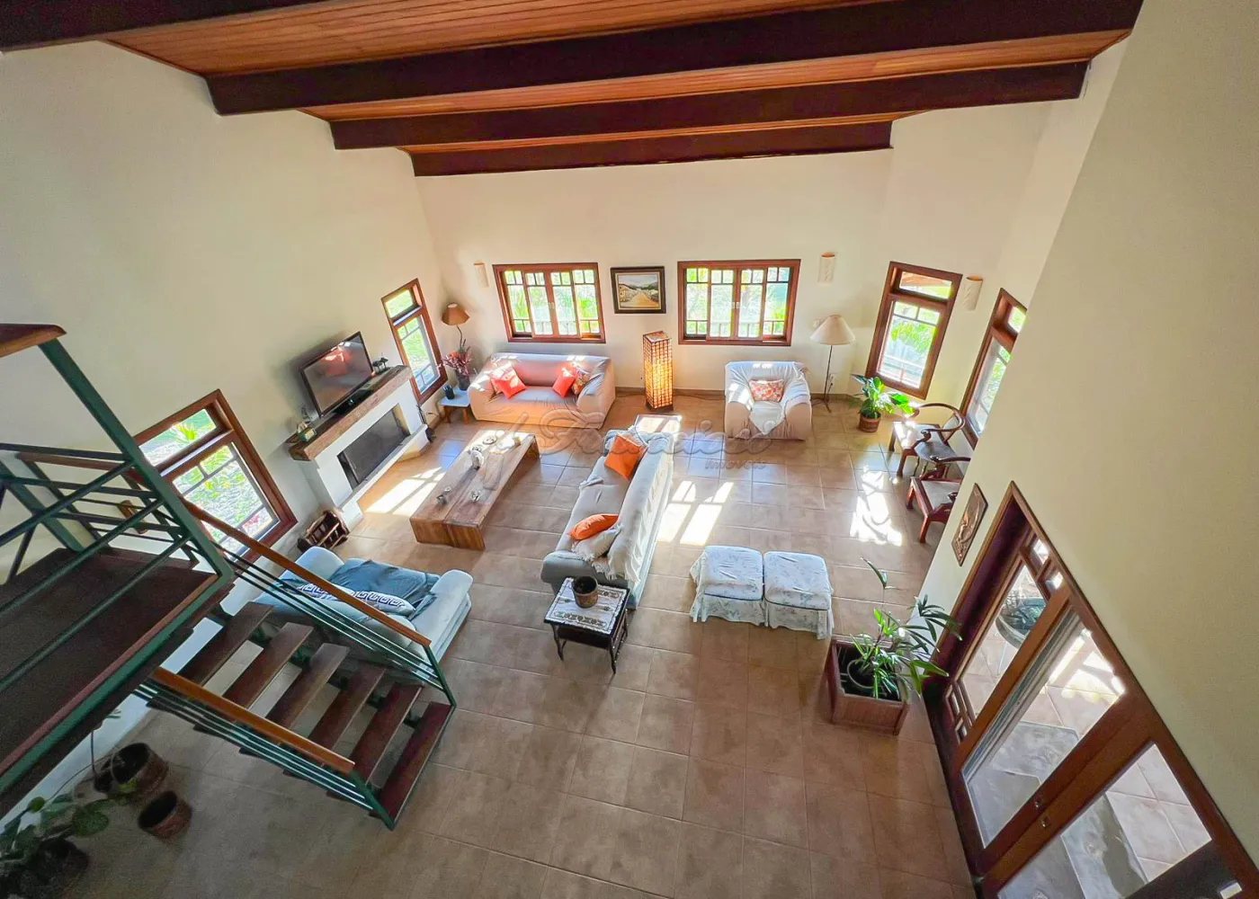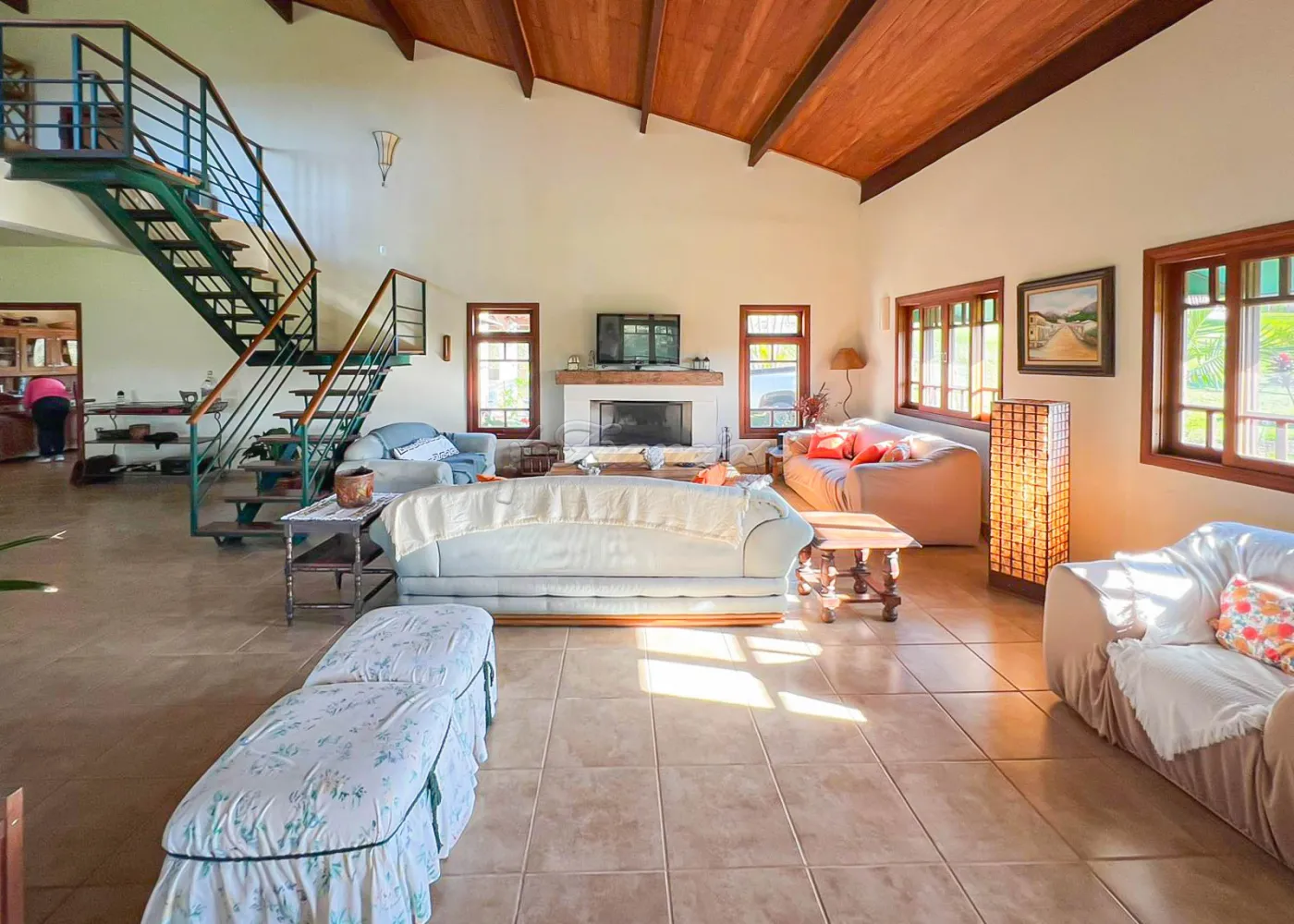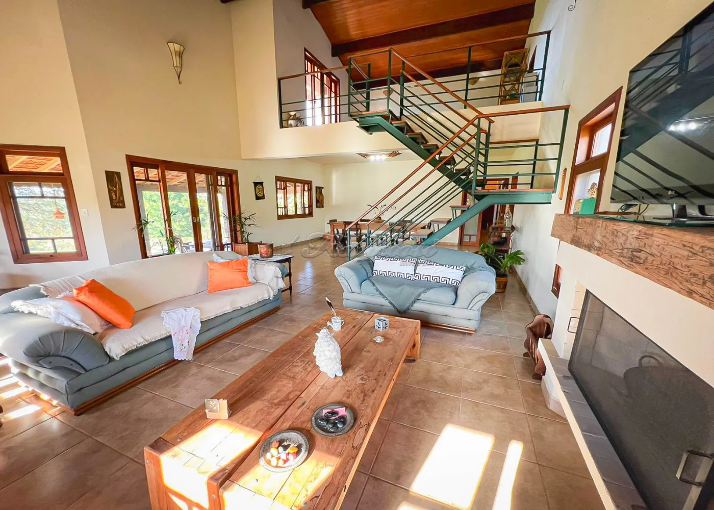 A casa sede possui aproximadamente 350 m², sendo totalmente mobiliada, com 4 banheiros, 4 dormitórios (5º opcional), 3 suítes, ampla sala de 80 m² com vários ambientes, mezanino e lareira, copa e cozinha integradas, além de 2 varandas ? social e gourmet ? e piscina.